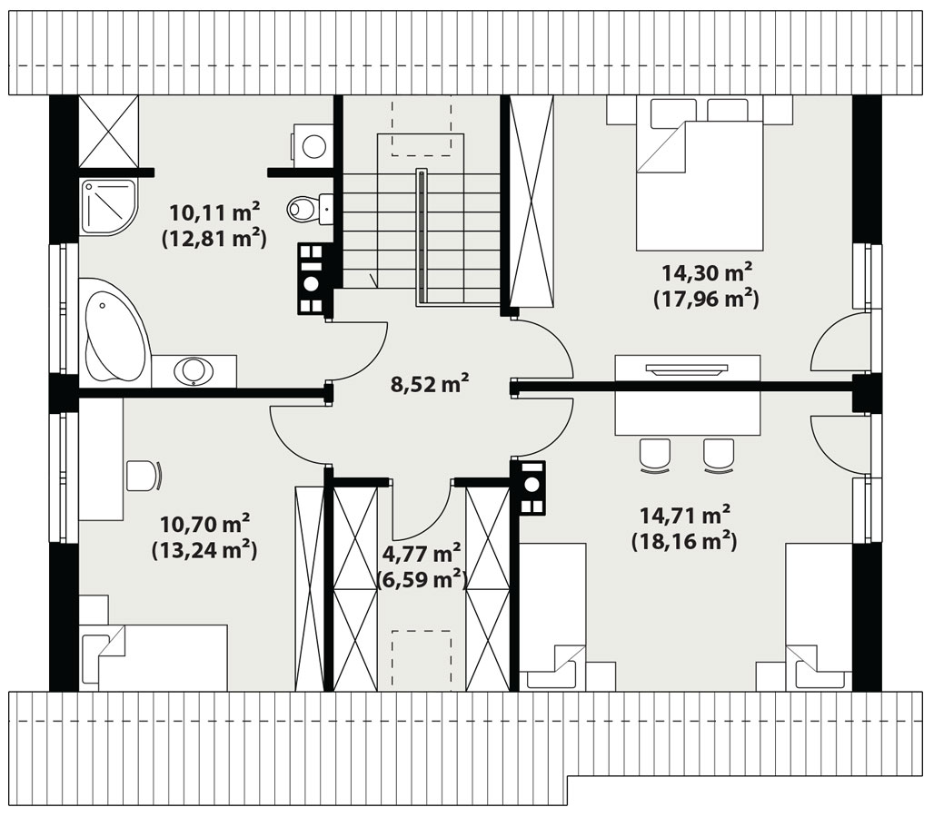 | Powierzchnia użytkowaDla domów parterowych: Suma powierzchni użytkowych wszystkich pomieszczeń bez garażu. Dla domów z poddaszem (dach spadzisty): Suma powierzchni użytkowych wszystkich pomieszczeń bez garażu i strychu. Na poddaszu, pod skosami dachu powierzchnię użytkową liczono wg zasady: - powyżej 2,2m wysokości pomieszczenia powierzchnia liczona w 100%, - pomiędzy 1,4m a 2,2m w 50%, - poniżej 1,4m powierzchnia nie jest brana pod uwagę. | 121.65 m² |
