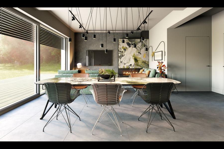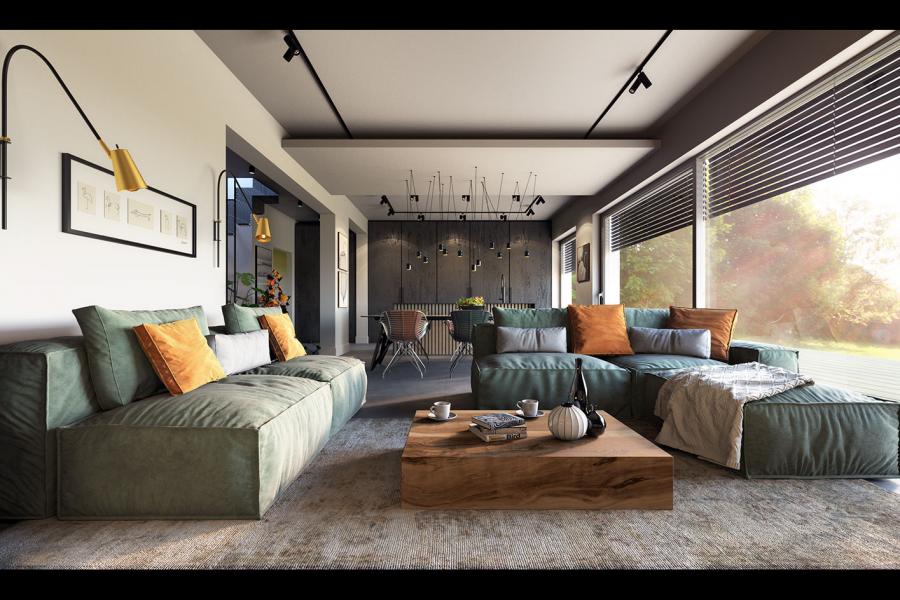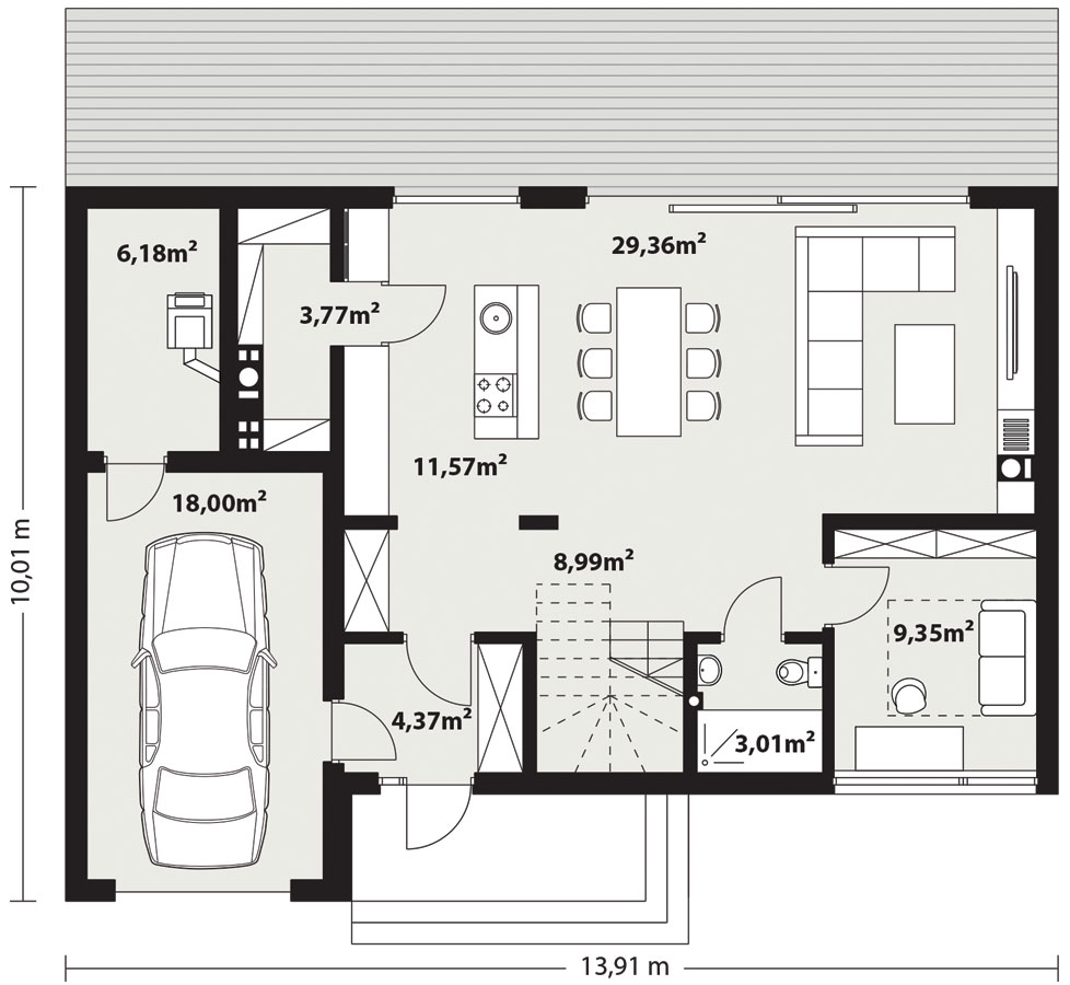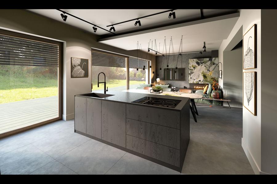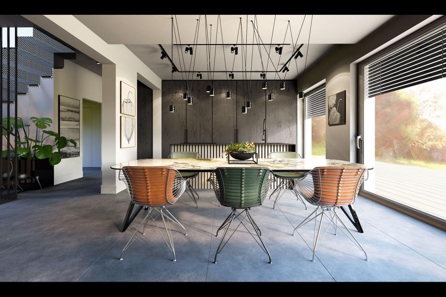 Projekt Kiri drewniany to dom parterowy z użytkowym poddaszem o nowoczesnej formie i funkcjonalnych, przestronnych wnętrzach. Zaprojektowany w technologii szkieletu drewnianego. Z pewnością spodoba się osobom preferującym nietuzinkowe rozwiązaniach. Prosta bryła budynku z dwuspadowym, bezokapowym dachem została urozmaicona przeszkleniami nadającym lekkości. Wyrafinowana stylistyka została osiągnięta poprzez subtelny detal oraz kontrast dwóch materiałów – antracytowej płytki elewacyjnej imitującej cegłę i ciepłego koloru drewnianej szalówki. Atutem projektu domu Kiri jest ciekawa, otwarta część dzienna, bardzo dobrze doświetlona dzięki ogromnym przeszkleniom. Taka aranżacja kuchni, salonu i jadalni sprawia, że wydają się one jeszcze większe, a krajobraz z zewnątrz staje się nieodzowną częścią wnętrza. Pasjonatom gotowania na pewno spodoba się wygodna, nowoczesna kuchnia dopełniona praktyczną, dużą spiżarnią. Funkcjonalny program parteru uzupełnia jeszcze gabinet, łazienka, duża kotłownia oraz jednostanowiskowy garaż. Szerokie, wygodne schody prowadzą na poddasze gdzie znajdują się 3 sypialnie. Największa z nich posiada własną łazienkę i garderobę. Całość funkcjonalną poddasza dopełnia wspólna łazienka i pralnia. Projekt Kiri drewniany jest idealną propozycją dla 4-5 osobowej rodziny, która ceni elegancki, nowoczesny wygląd budynku i jego wyrafinowaną stylistykę.