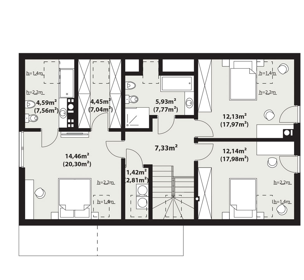| Powierzchnia użytkowaDla domów parterowych: Suma powierzchni użytkowych wszystkich pomieszczeń bez garażu. Dla domów z poddaszem (dach spadzisty): Suma powierzchni użytkowych wszystkich pomieszczeń bez garażu i strychu. Na poddaszu, pod skosami dachu powierzchnię użytkową liczono wg zasady: - powyżej 2,2m wysokości pomieszczenia powierzchnia liczona w 100%, - pomiędzy 1,4m a 2,2m w 50%, - poniżej 1,4m powierzchnia nie jest brana pod uwagę. | 139.05 m² |