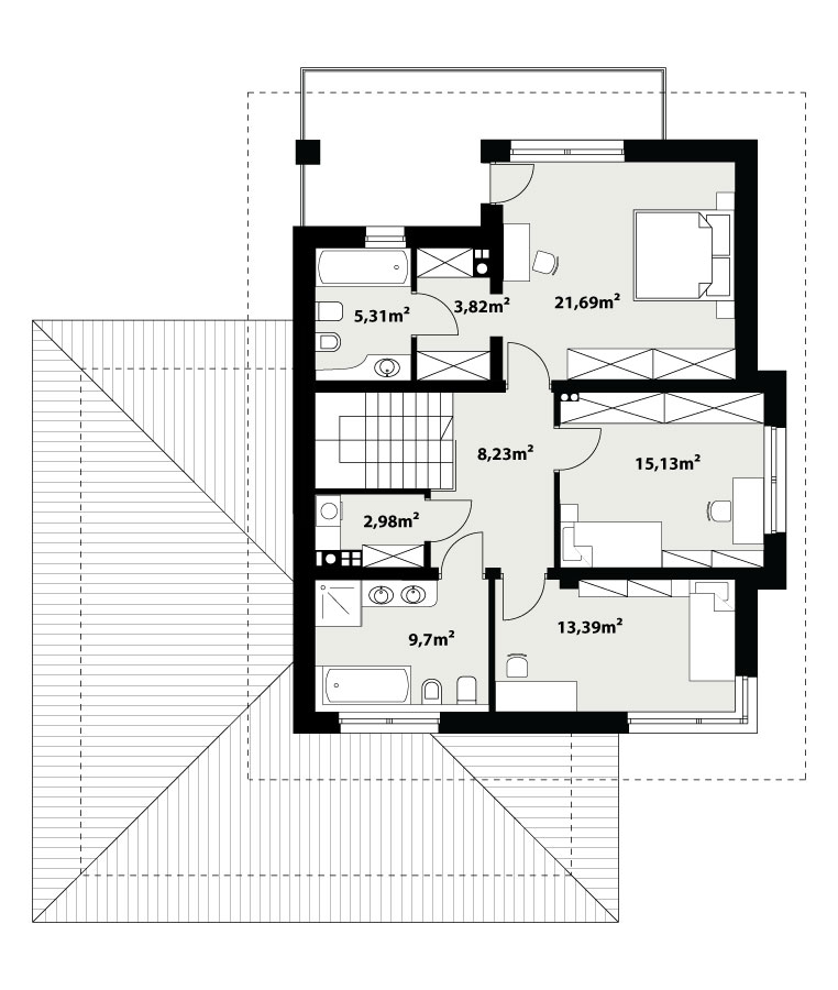| Powierzchnia zabudowyPowierzchnia terenu, zajęta przez budynek w stanie wykończonym, bez tarasów, schodów zewnętrznych i podjazdów (PN-ISO 9836: 1997) | 169.71 m² |