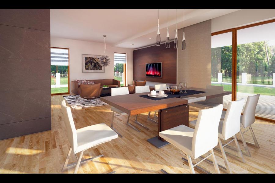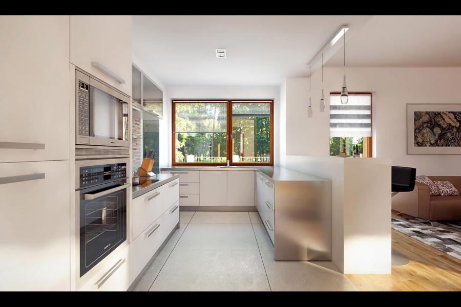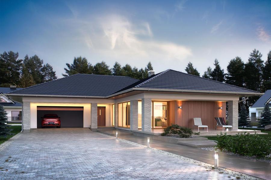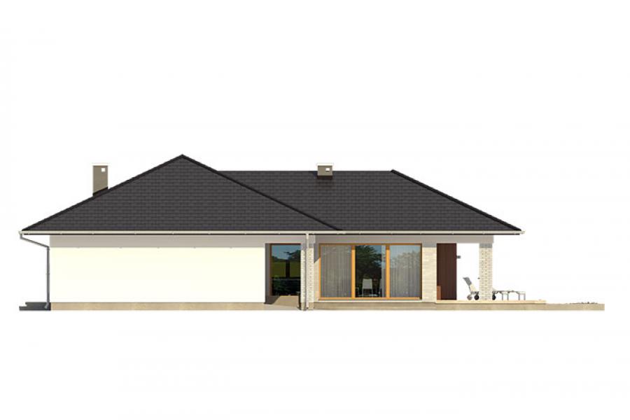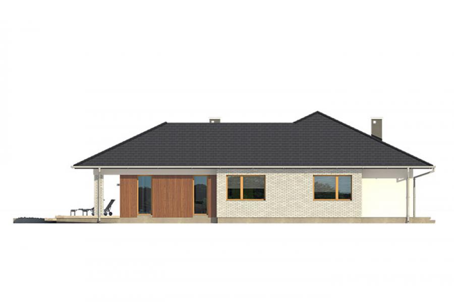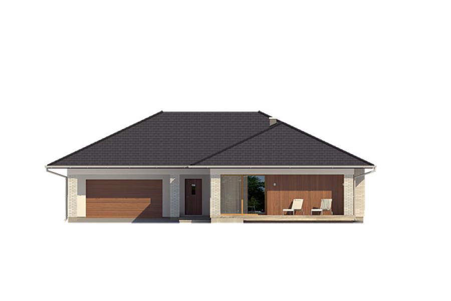Parterowy dom jednorodzinny, niepodpiwniczony z dwustanowiskowym garażem. Jest to wygodny , funkcjonalny dom, który swoim pełnym programem zapewnia optymalny komfort 4-osobowej rodzinie. Przestronna część dzienna to salon połączony z jadalnią, otwierający się na ogród poprzez ogromne przeszklenie oraz otwarta kuchnia wraz z półwyspem i ze spiżarnią. Tak zaproponowany, ciekawy i przestronny układ pomieszczeń umożliwia szereg aranżacji. Część nocna to 3 wygodne sypialnie oraz przestronna łazienka. W domu zaprojektowano dużą kotłownię dostępną z garażu, której parametry pozwalają na montaż kotła na każdy rodzaj paliwa, w tym na paliwo stałe. Sam garaż, którego wielkość przekracza parametry standardowego garażu dwustanowiskowego, umożliwia umieszczenie tam np. kosiarki. Ten optymalny i ciekawy program funkcjonalny został ujęty w prostej bryle na rzucie litery L, przykrytej wielospadowym dachem. Atutem projektu jest jego prostota zarówno w układzie pomieszczeń jak i w rozwiązaniach elewacji, gdzie elegancki, nowoczesny styl osiągnięto poprzez klasyczne, proste ale szlachetne materiały oraz delikatny, subtelny detal.