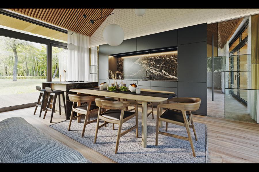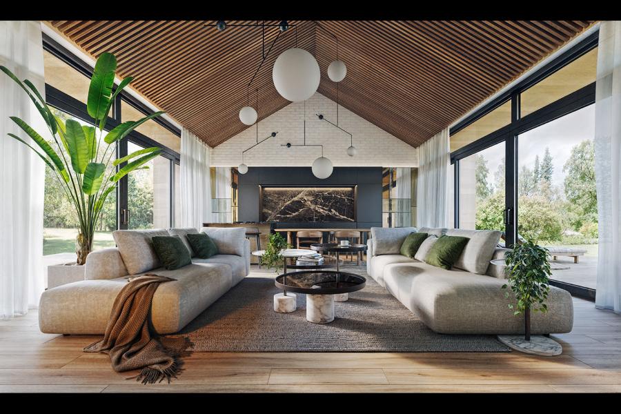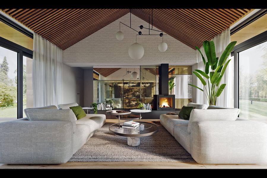 Sercem domu jest imponująca przestrzeń o powierzchni blisko 47 m², łącząca salon, jadalnię i kuchnię. Dzięki ogromnym przeszkleniom po obu stronach budynku, wnętrze jest skąpane w naturalnym świetle o każdej porze dnia. Wizualizacje zdradzają detale, których nie oddaje suchy opis: lamelowy wykończenie wysokiego sufitu dodaje wnętrzu przytulności i nowoczesnego sznytu, a centralnie umieszczona wyspa kuchenna staje się idealnym miejscem na poranną kawę. Wieczory umili nowoczesny, minimalistyczny kominek, widoczny w strefie wypoczynkowej.
