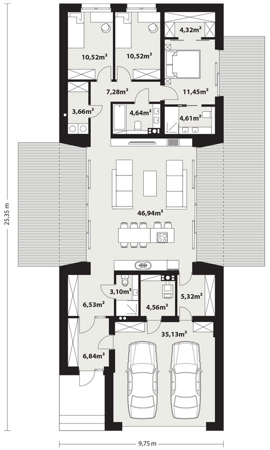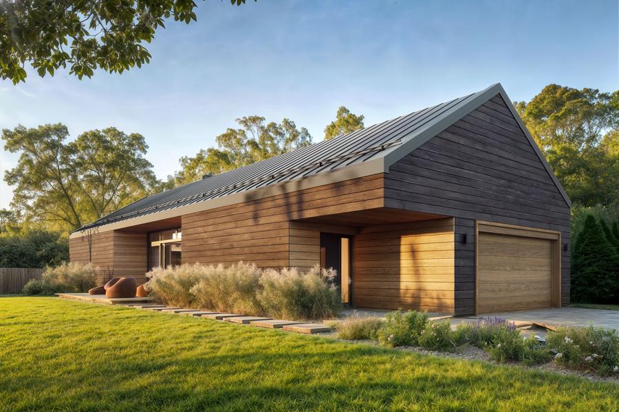 - Wygodny garaż: Szerokie stanowisko na dwa samochody wkomponowane w bryłę budynku.