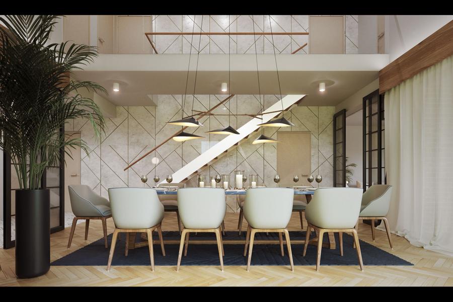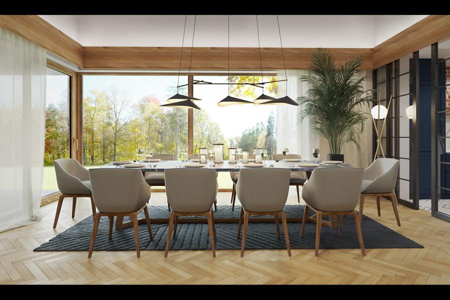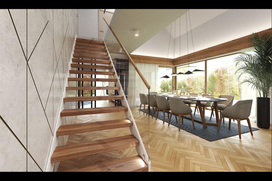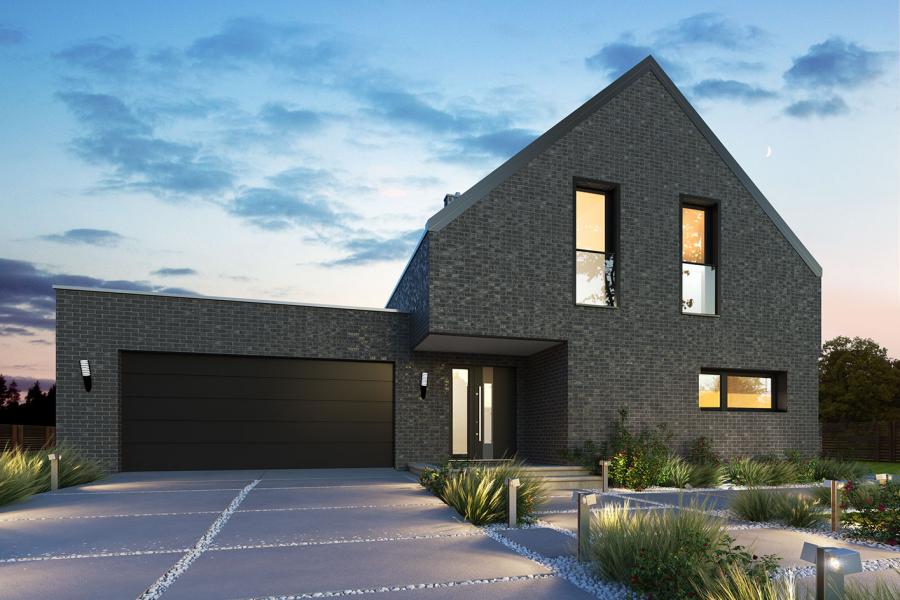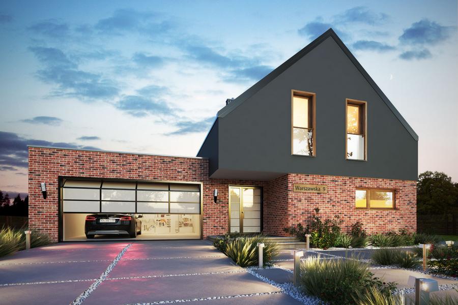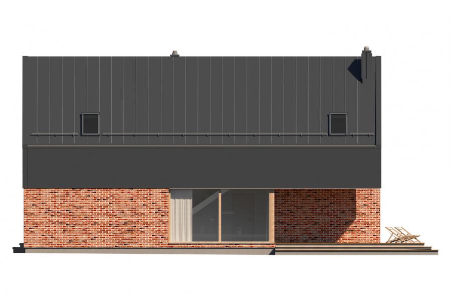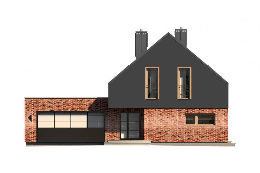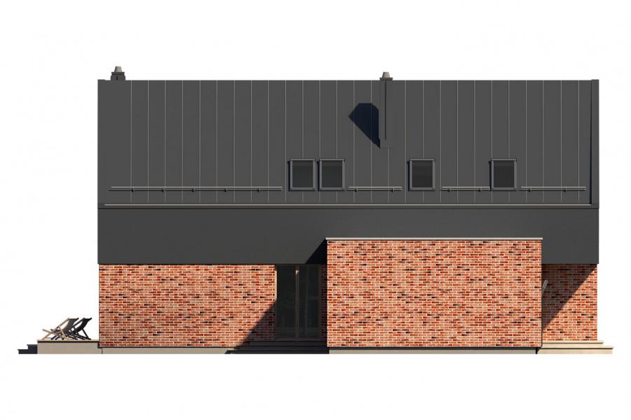 Lifi to projekt atrakcyjnego, nowoczesnego i bardzo funkcjonalnego domu parterowego z poddaszem użytkowym, przykrytego modnym dachem bezokapowym. Powstał on z myślą o wspólnym spędzaniu czasu z rodziną i przyjaciółmi oraz wypoczynku na łonie natury. Gustowne, naturalne materiały elewacyjne i liczne przeszklenia sprawiają, że dom idealnie wpisuje się w otaczający krajobraz. Budynek prezentuje się wyjątkowo elegancko i jest doskonałą propozycją dla bardzo wymagających inwestorów, szukających wygodnego i funkcjonalnego domu z charakterem. Prosta bryła budynku, na rzucie prostokąta, z dostawionym garażem, nabrała "pazura" dzięki zastosowaniu ciekawych rozwiązań elewacji. Do wykończenia ścian zewnętrznych wykorzystano cieniowane płytki elewacyjne w czerwono-czarnym kolorze, które w połączeniu z czarnym tynkiem tworzą niezwykle atrakcyjną i wyjątkową, ale równocześnie minimalistyczną całość. Nowoczesny charakter budynku podkreślają duże przeszklenia, szczególnie w części dziennej, ciekawie wkomponowane w elewację oraz płaska, elegancka dachówka. Taras wypoczynkowy, który stanowi naturalne przedłużenie otwartej i przeszklonej jadalni, poprzez swoje zadaszenie umożliwia korzystanie z niego bez względu na panujące warunki atmosferyczne. We wnętrzu domu zastosowano bardzo ciekawe rozwiązania projektowe. Na uwagę zasługuje przede wszystkim otwarta i ciekawie zaaranżowana przestrzeń centralna domu, czyli duża, całkowicie przeszklona jadalnia z antresolą oraz jednobiegowe designerskie schody. Niewątpliwym atutem projektu jest również przestronny wydzielony salon. Do dyspozycji domowników na parterze przewidziano również kuchnię ze spiżarnią, gabinet, łazienkę, kotłownię oraz dwustanowiskowy garaż.Na poddaszu znajdują się: sypialnia małżeńska z prywatną garderobą i łazienką, 2 sypialnie dla dzieci, wspólna łazienka i pralnia. Cała komunikacja górnej kondygnacji przebiega wzdłuż antresoli, z której można podziwiać aranżację jadalni i otoczenia domu. Lifi to wyjątkowa propozycja dla osób szukających nowoczesnych rozwiązań projektowych, nietuzinkowego spojrzenia na architekturę oraz ciekawie zaaranżowanej przestrzeni wewnętrznej.