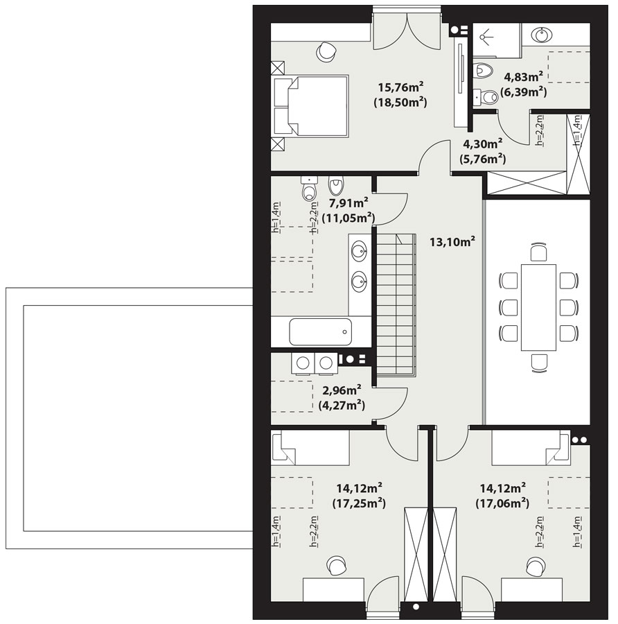 | Powierzchnia użytkowaDla domów parterowych: Suma powierzchni użytkowych wszystkich pomieszczeń bez garażu. Dla domów z poddaszem (dach spadzisty): Suma powierzchni użytkowych wszystkich pomieszczeń bez garażu i strychu. Na poddaszu, pod skosami dachu powierzchnię użytkową liczono wg zasady: - powyżej 2,2m wysokości pomieszczenia powierzchnia liczona w 100%, - pomiędzy 1,4m a 2,2m w 50%, - poniżej 1,4m powierzchnia nie jest brana pod uwagę. | 170 m² |