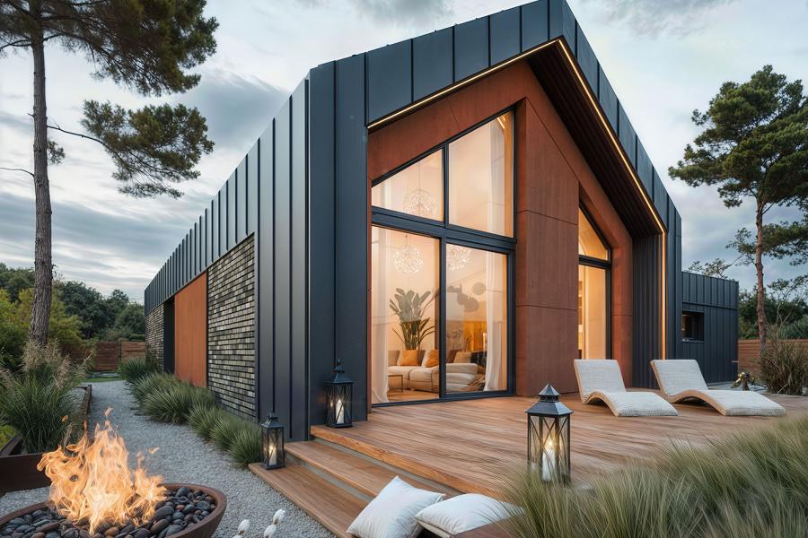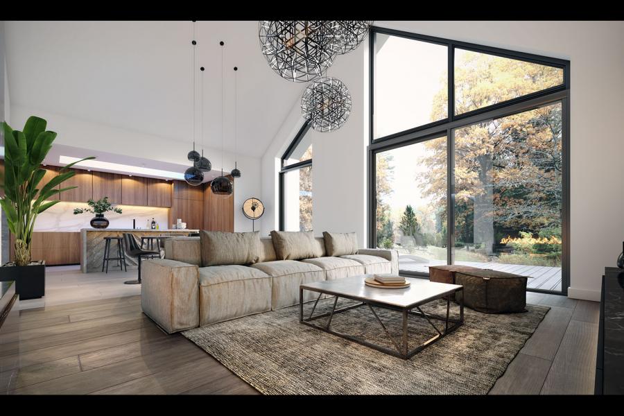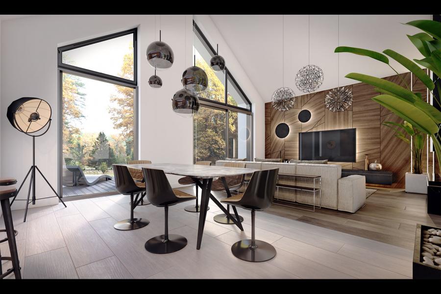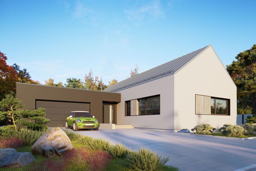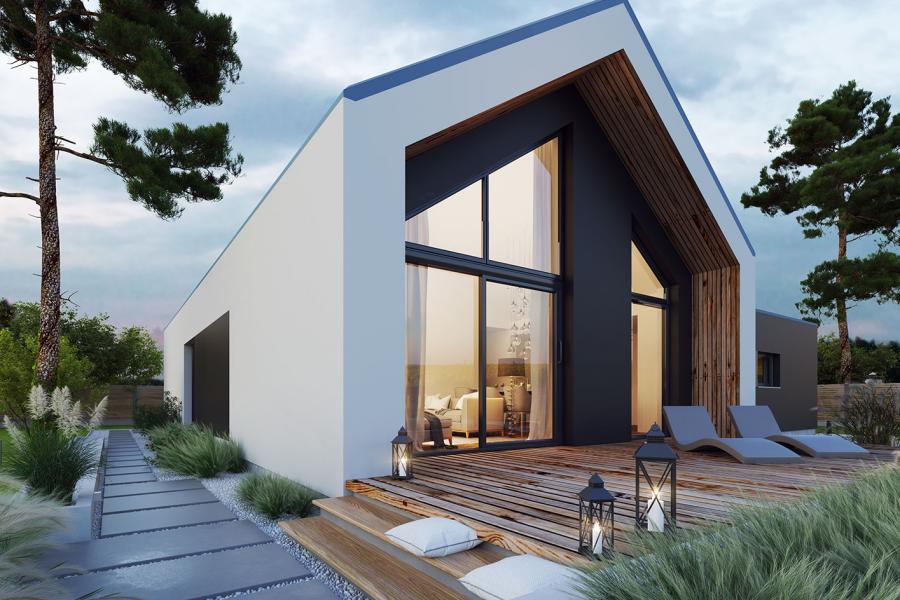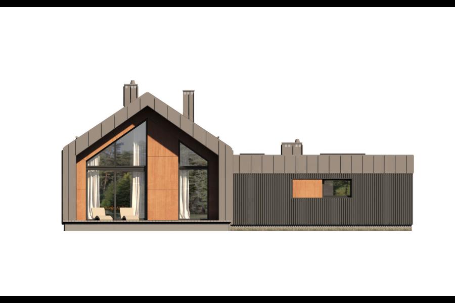 Dom Lili 2 to ciekawa propozycja dla inwestorów ceniących współczesne spojrzenie na architekturę. Projekt ma bardzo interesującą aranżację zewnętrzną i swoim charakterem nawiązuje do stylu nowoczesnej stodoły. W domu Lili 2 główna bryła budynku, która odwołuję się do archetypu domu, na rzucie prostokąta przykrytego dwuspadowym, bezokapowym dachem, zestawiona jest z prostą bryłą garażu i wejścia z płaskim dachem. Nowoczesną stylistykę podkreśla dodatkowo ogromne przeszklenie w części dziennej, stanowiące obok cofniętego wejścia, główny akcent budynku. Współczesny, minimalistyczny charakter domu uzyskano dzięki elewacjom wykończonym kontrastującym ze sobą białym i czarnym tynkiem, urozmaiconym szalówką w kolorze naturalnego drewna, które idealnie komponują się z szarą blachą na rąbek. Dom Lili 2, który kształtem nawiązuje do tradycyjnych wzorców typowych dla terenów wiejskich, we wnętrzu zachował bardzo przejrzysty, funkcjonalny i bogaty program użytkowy dla 3-4 osobowej rodziny. Układ domu został podzielony na 3 strefy, gdzie część dzienna to przestronny salon z jadalnią, kuchnia ze spiżarnią. Strefa intymna składa się z 3 sypialni, łazienki i pralni, z czego największa sypialnia ma własną garderobę i łazienkę. Część gospodarcza to dwustanowiskowy garaż i kotłownia. Niewątpliwym atutem projektu jest zastosowanie dużego tarasu oraz licznych przeszkleń zarówno w części dziennej, jak i w każdej z sypialni, co pozwala na otwarcie domu "na zewnątrz" i cieszenie się z pięknych, naturalnych walorów działki.