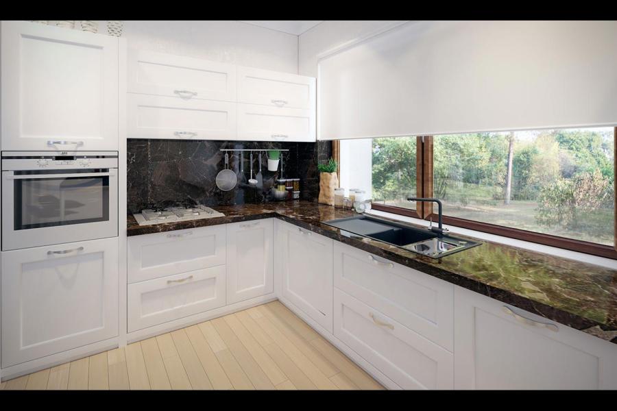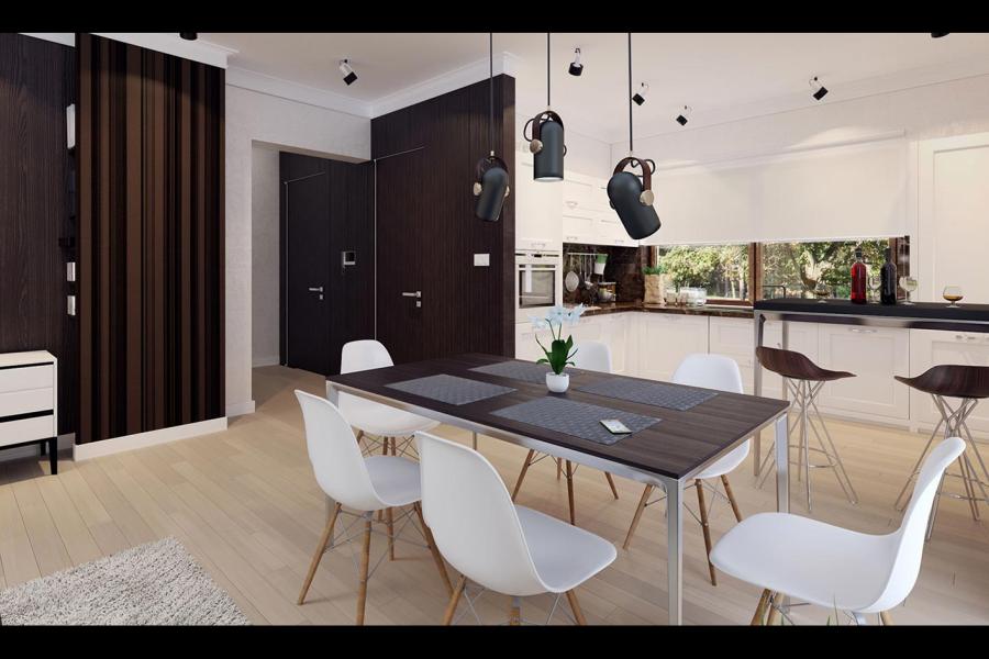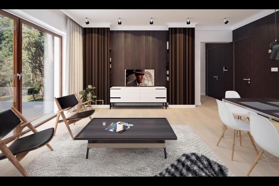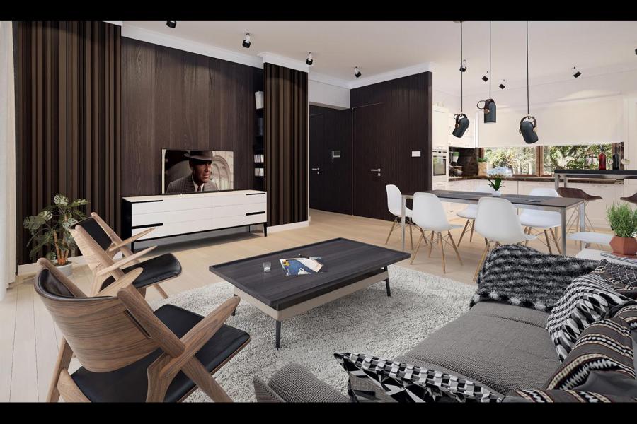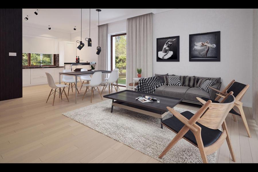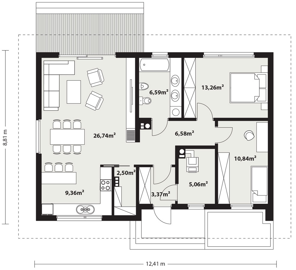 Lori drewniany to projekt domu parterowego jednorodzinnego zapewniającego komfort 3-4 osobowej rodzinie. Jest to dom zaprojektowany z wyraźnym podziałem na strefy. W przestronnej części dziennej znajduje się duży salon z miejscem na kominek, jadalna i kuchnia ze spiżarnią. W salonie zaprojektowane zostało duże przeszklenie, umożliwiające wyjście na taras. W strefie dziennej znajduje się też wiatrołap, z którego mamy dostęp do sporych rozmiarów kotłowni. Pomieści ona kocioł gazowy lub kocioł na paliwo stałe. Pozostała część parteru to strefa nocna, która składa się z 2 sypialni i przestronnej łazienki. W łazience znajdzie się miejsce na dwie umywalki, wannę, toaletę, bidet i pralkę. Powierzchnia użytkowa domu to 84,3 m2. Lori drewniany to idealny projekt parterowego domu dla osób ceniących sobie minimalizm i funkcjonalność.