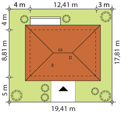 Przed wyborem projektu warto wziąć pod uwagę usytuowanie budynku na działce pod kątem stron świata. Najbardziej optymalne ustawienie to takie kiedy wejście do domu znajdować się będzie od strony północnej, a taras od południowej. Minimalna powierzchnia działki przy projekcie domu Lori to 345,69 m2. Co daje minimalną szerokość działki 19,41m i minimalną długość 17,81m. Zanim jednak zdecydujemy się na kupno gotowego projektu należy sprawdzić czy będzie on zgodny z miejscowym planem zagospodarowania przestrzennego lub decyzją o warunkach zabudowy wydanych na konkretną działkę. Często w miejscowych planach lub decyzjach występuje szereg uwarunkowań co do usytuowania domu. Mogą to być np. nieprzekraczalne linie zabudowy, a wtedy minimalne wymiary działki podane wyżej ulegną zmianie.