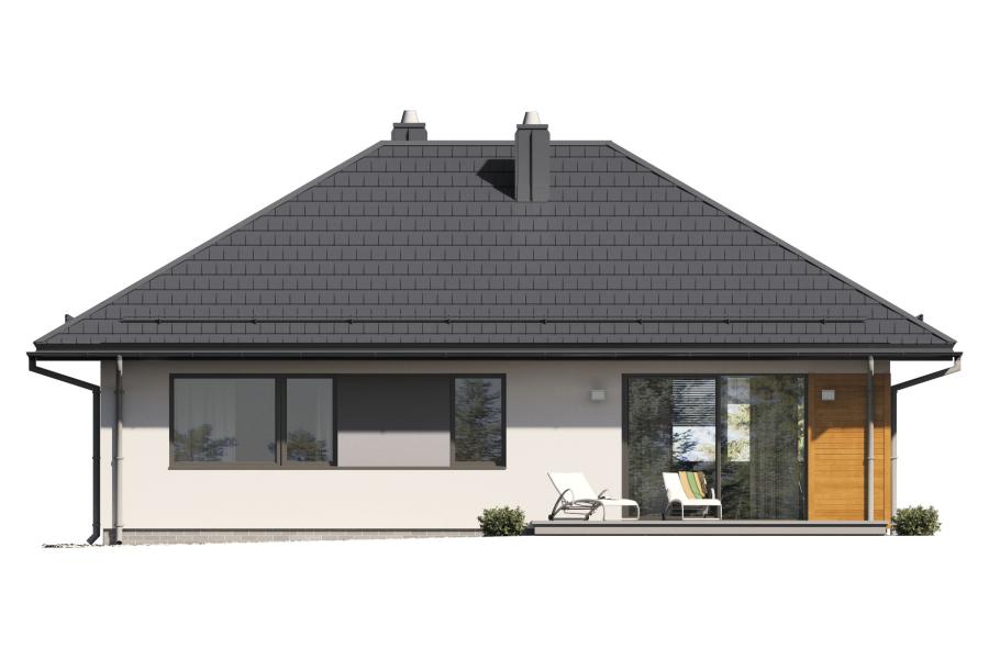 Bryła budynku zaprojektowana została na rzucie prostokąta. Jednokondygnacyjny dom bez garażu jest przykryty kopertowym dachem. Kąt nachylenia połaci to 25 stopni. Dach może zostać wykonany z dachówki lub blachodachówki. Wejście do domu posiada niewielki podcień, który chroni przed deszczem i słońcem. Dom ma duży taras, który można wykonać z drewna, desek kompozytowych lub płyt kamiennych. Aby korzystać z niego przy każdej pogodzie, można dobudować nad tarasem zadaszenie w konstrukcji drewnianej bądź aluminiowej ze składanym dachem. Równie dobrym rozwiązanie będzie tutaj rozwijana markiza. Przy projektowaniu elewacji domu postawiono na nowoczesne i sprawdzone rozwiązania kolorystyczne i materiałowe. Duże okna w grafitowych ramach, dach i rynny w tym samym kolorze, jasny tynk oraz szalówka w ciepłym odcieniu drewna. Ściany zewnętrzne oraz wewnętrzne domu Lori zaprojektowane są w technologii szkieletu drewnianego. Taka forma budynku sprawia , że będzie on prosty w budowie i tani w eksploatacji.