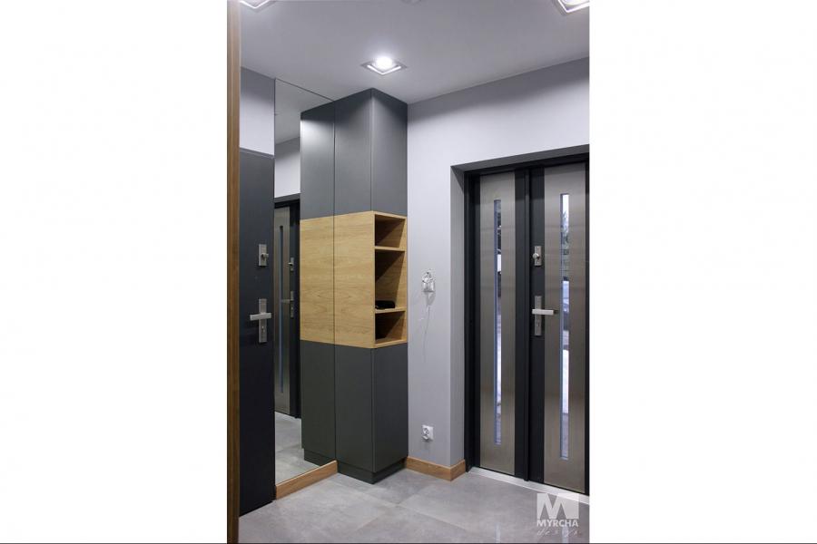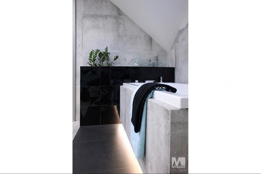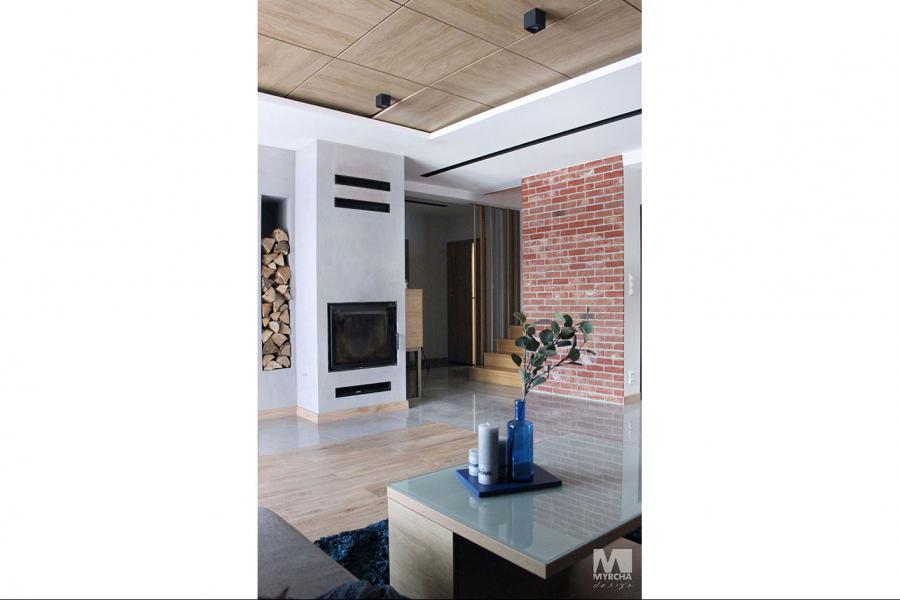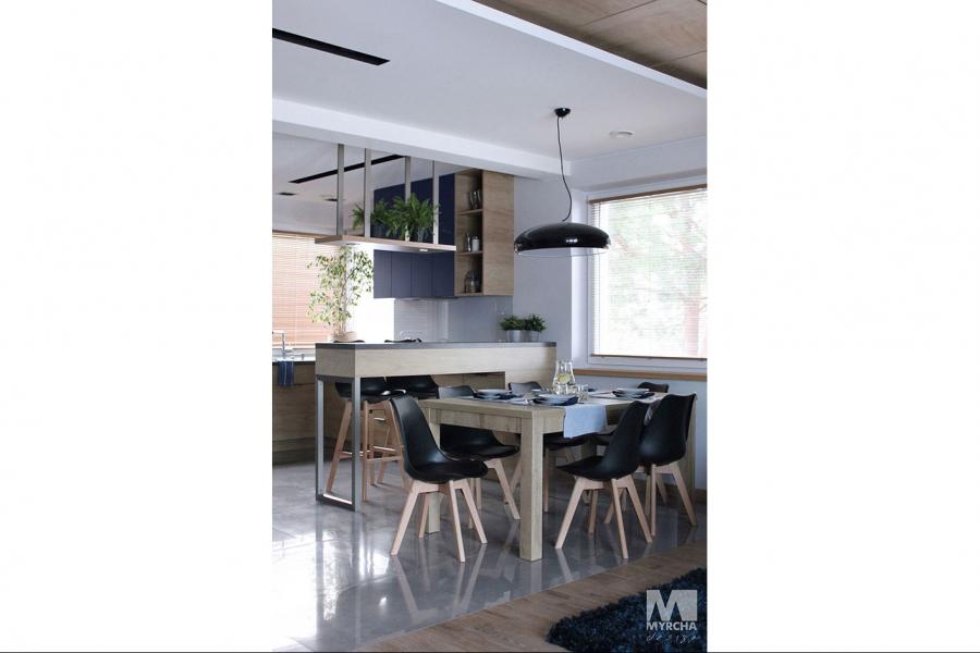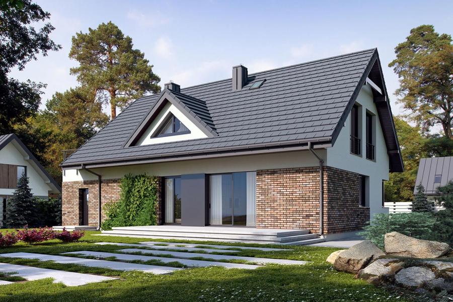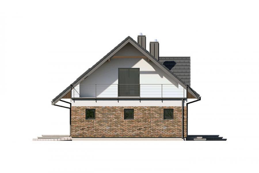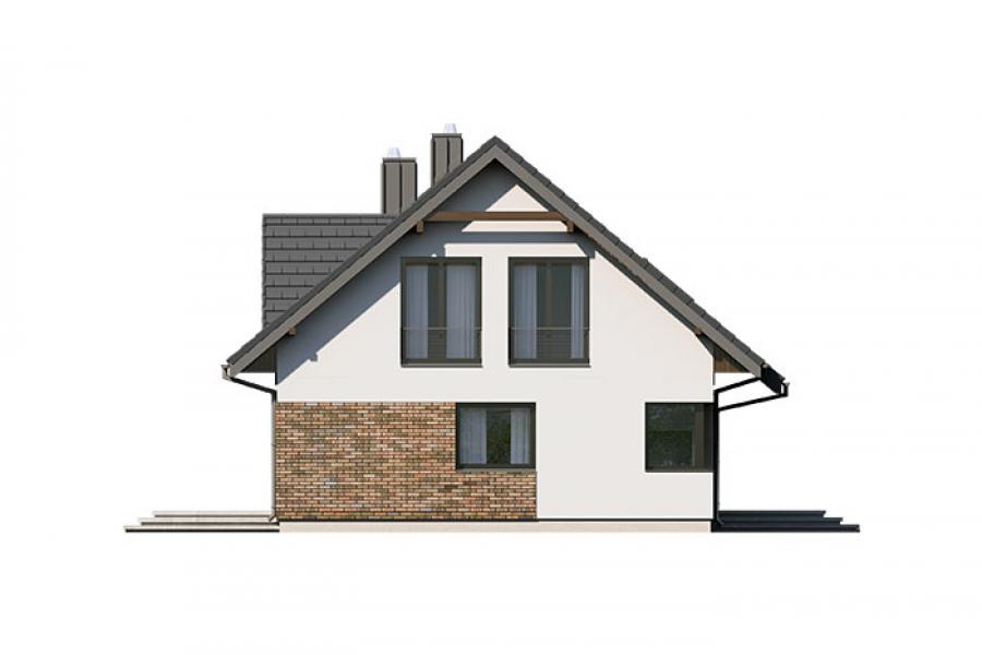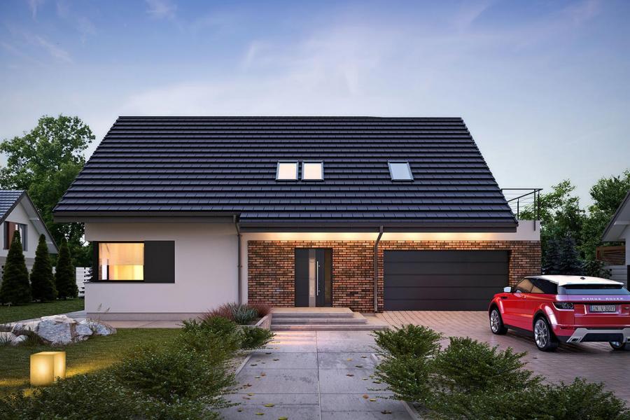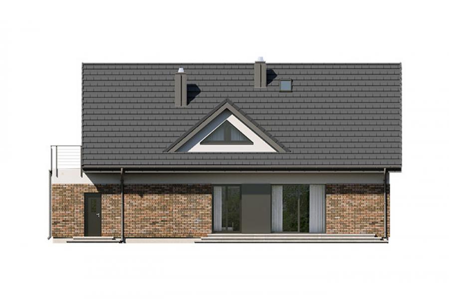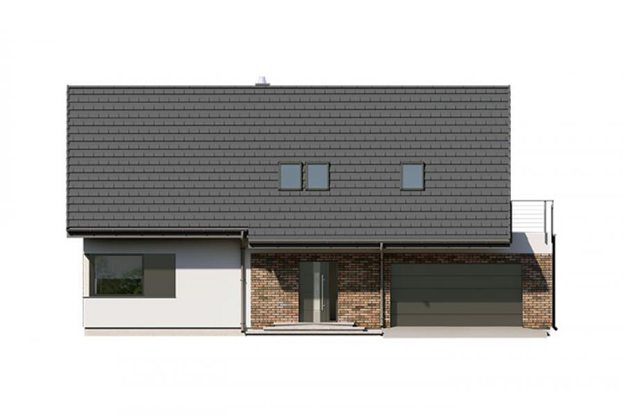 Dom jednorodzinny parterowy z użytkowym poddaszem, o klarownym podziale na strefy funkcjonalne. Na parterze po lewej stronie od wejścia znajduje się strefa dzienna: kuchnia, ze spiżarnią pod schodami, jadalnia oraz pokój dzienny z wyjściem na taras. Po prawej stronie od wejścia wydzielono strefę garażową na dwa stanowiska oraz obszerną kotłownię z wyjściem na zewnątrz. W strefie środkowej zaprojektowano dodatkową sypialnię oraz łazienkę ogólnodostępną. Poddasze użytkowe stanowi strefę prywatną obejmującą główną sypialnię z wyjściem na taras, dwie garderoby, przestronną łazienkę, dwie sypialnie dziecięce oraz przestrzeń rekreacyjną otwartą na klatkę schodową.