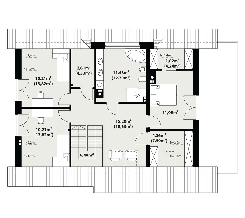 | Powierzchnia użytkowaDla domów parterowych: Suma powierzchni użytkowych wszystkich pomieszczeń bez garażu. Dla domów z poddaszem (dach spadzisty): Suma powierzchni użytkowych wszystkich pomieszczeń bez garażu i strychu. Na poddaszu, pod skosami dachu powierzchnię użytkową liczono wg zasady: - powyżej 2,2m wysokości pomieszczenia powierzchnia liczona w 100%, - pomiędzy 1,4m a 2,2m w 50%, - poniżej 1,4m powierzchnia nie jest brana pod uwagę. | 151.25 m² |