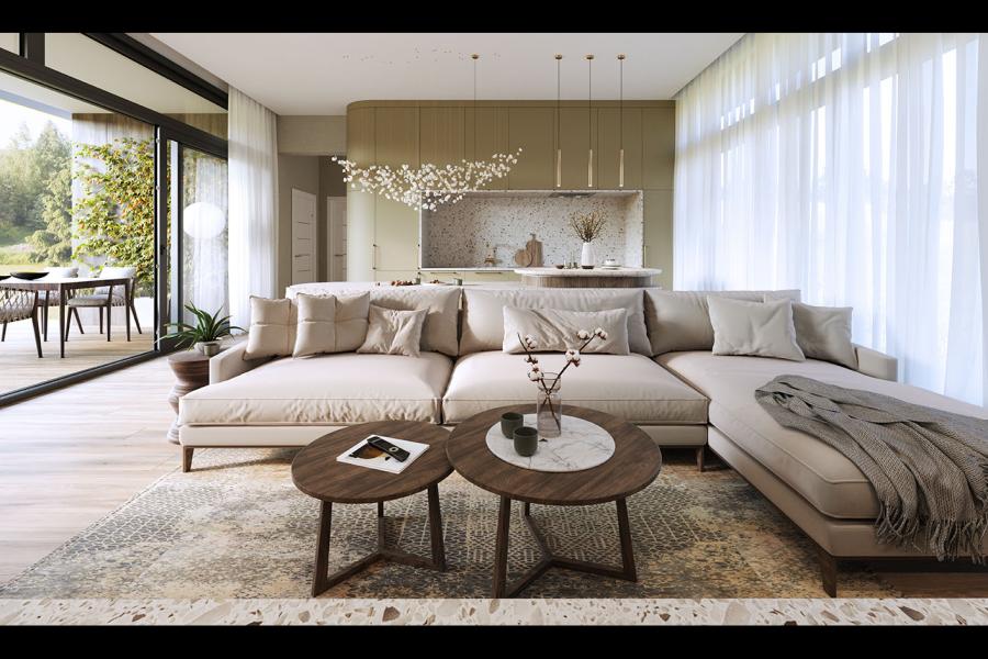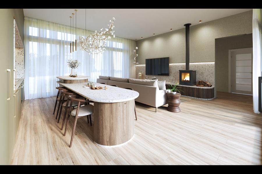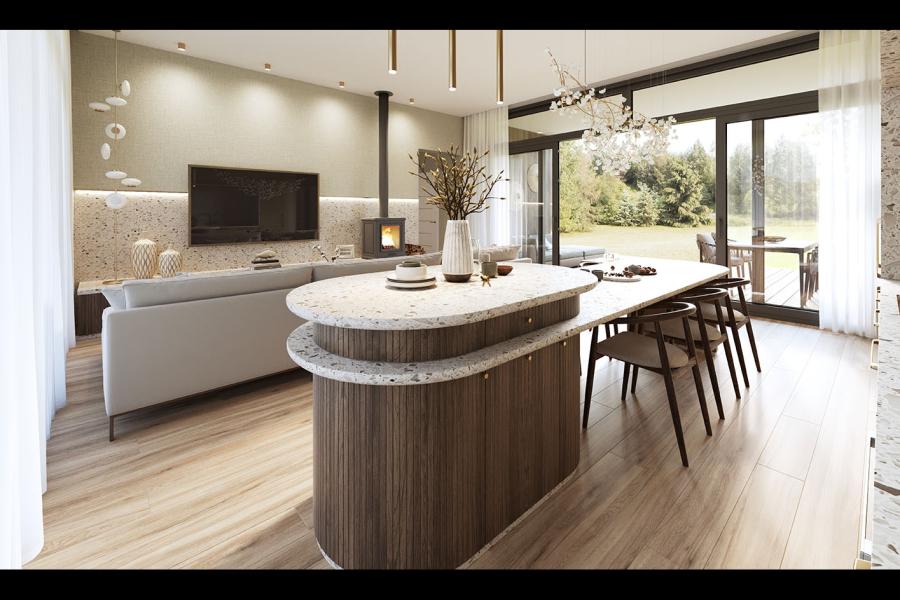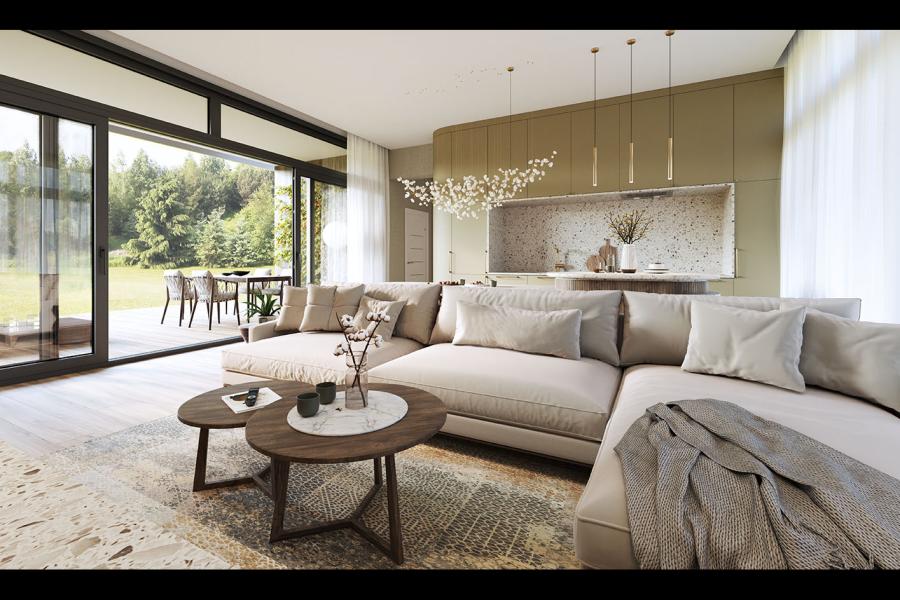 - Przeszklony salon: Spektakularna strefa dzienna z panoramicznym widokiem na ogród i wyjściem na taras.