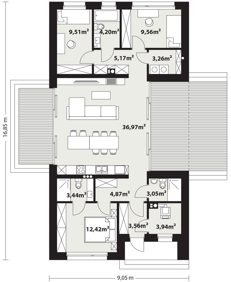 - Dużo miejsca na przechowywanie: Korytarz zaprojektowany jako ciąg szaf oraz wydzielona pralnia.