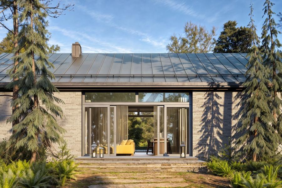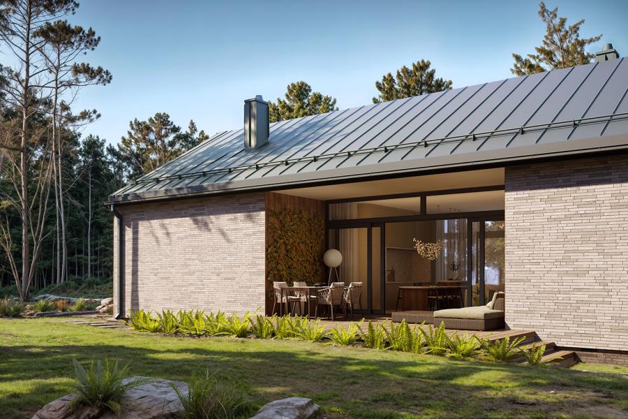 - Ponadczasowy design: Modna bryła nowoczesnej stodoły wykończona trwałymi materiałami (płytka, drewno).
