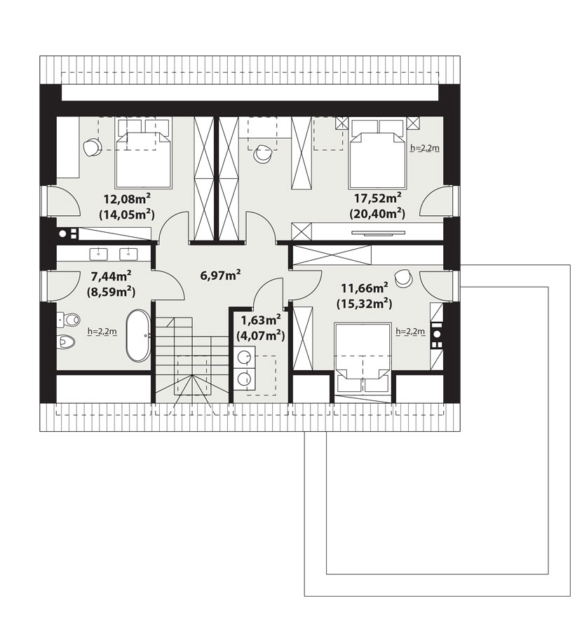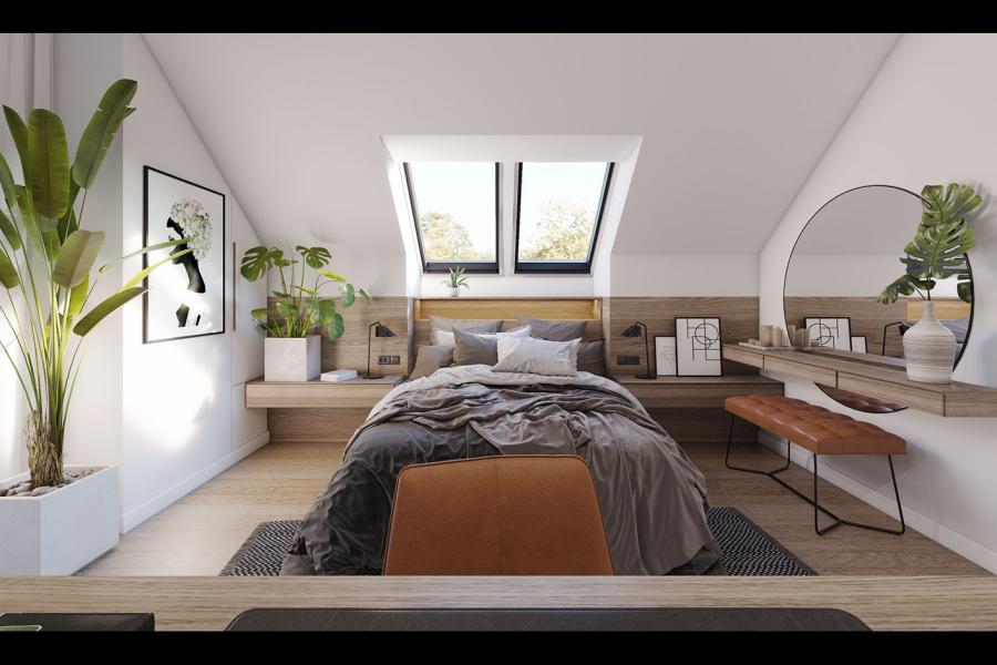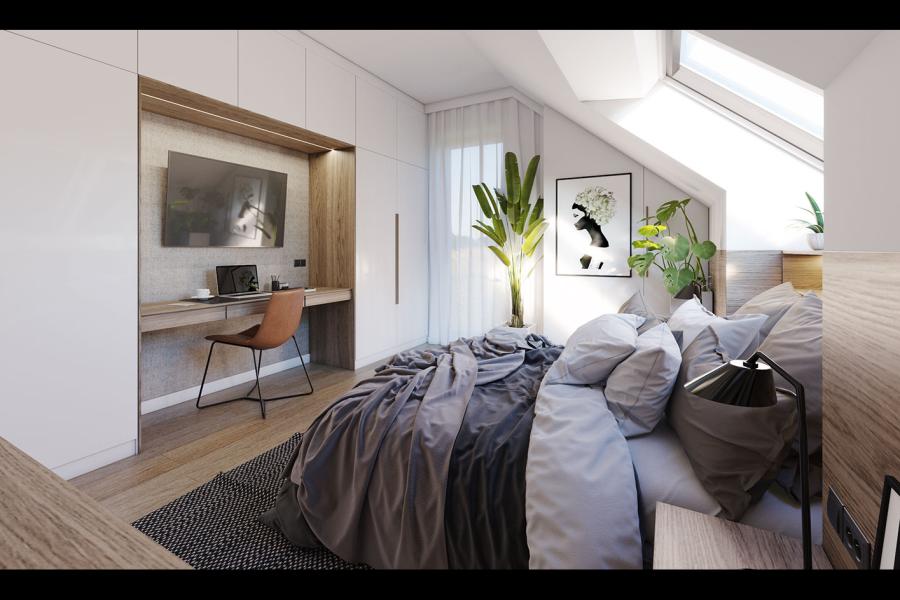 Atutem projektu domu Mona 2 jest to, że na poddaszu oprócz trzech sypialni i łazienki znajduje się również osobna pralnia. Bardzo ułatwi ona codzienne funkcjonowanie 4-5 osobowej rodziny. Przestronne sypianie zostały bardzo dobrze doświetlone dzięki oknom w elewacji oraz w połaciach dachu. Największa z nich posiada własną garderobę, którą można zaaranżować jako kącik do pracy. Łazienka pomieści dużą wannę, dwie umywalki, wc i bidet.