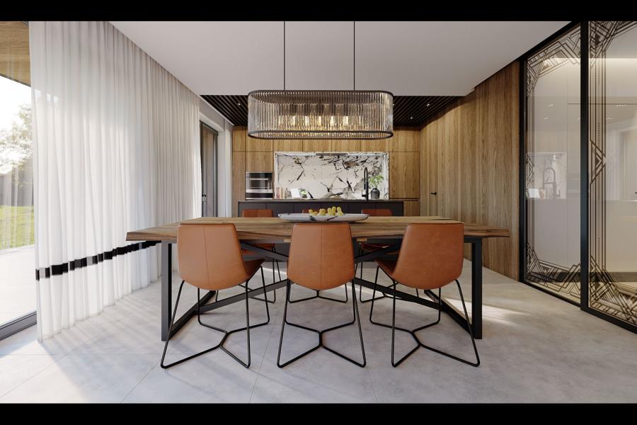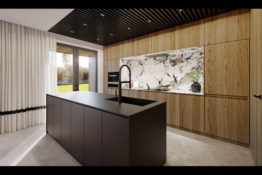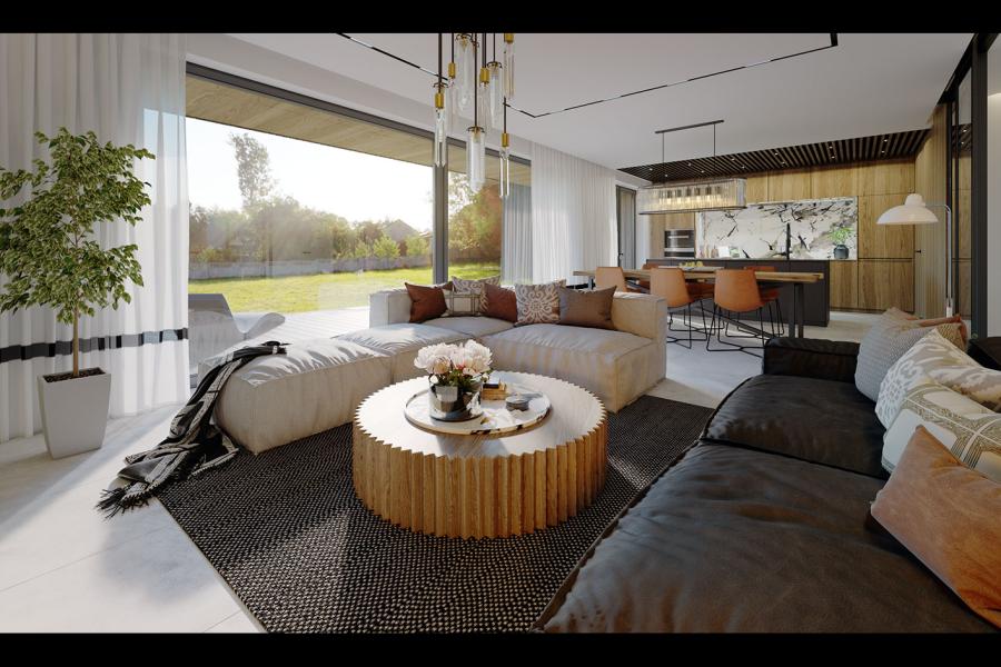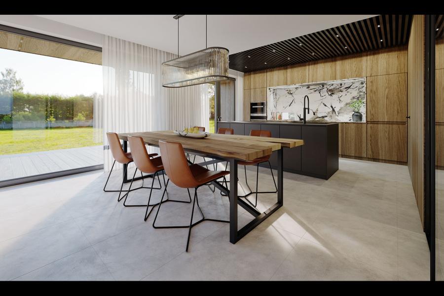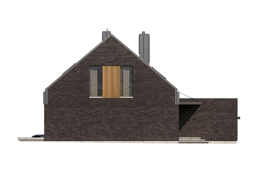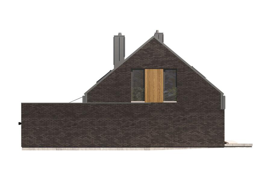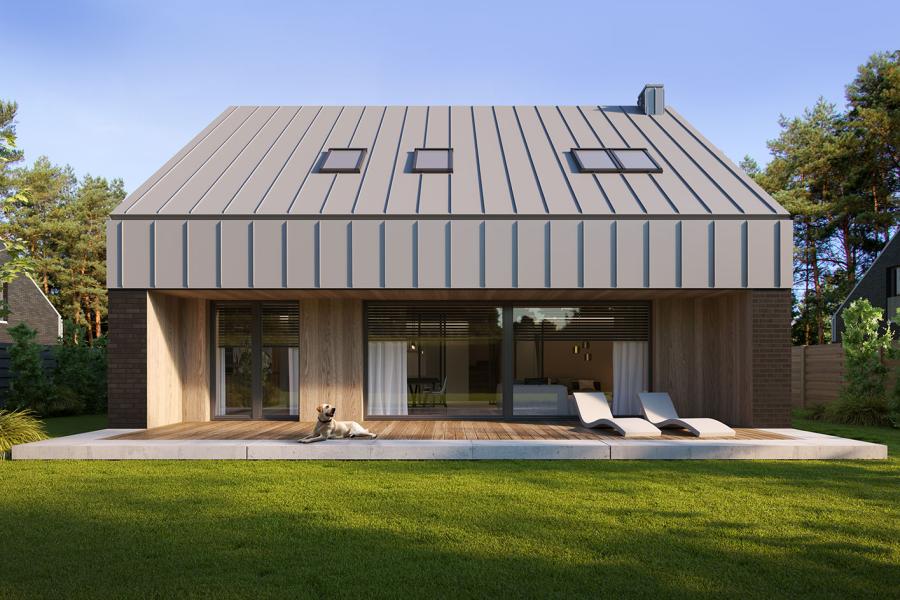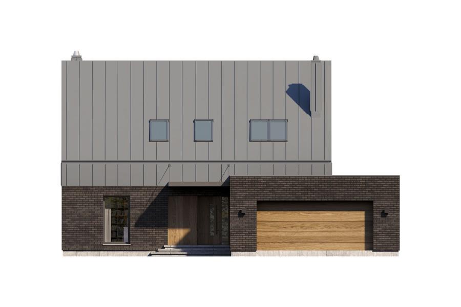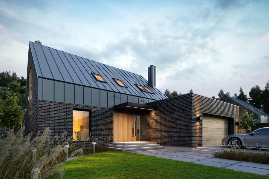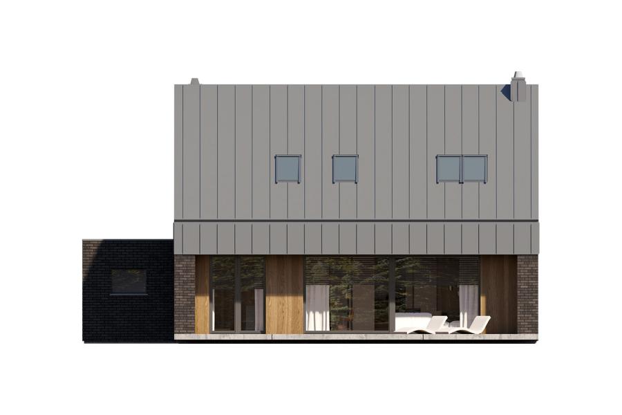 Projekt Mona 2 to parterowy dom jednorodzinny z użytkowe poddasze. Bryła ma prostą i nowoczesną formę, która z pewnością zachwyci osoby zafascynowane nowoczesną architekturą. Dom parterowy został zaprojektowany na planie prostokąta. Część główna domu Mona 2 jest zadaszona dwuspadowym dachem, nieposiadającym okapów. Kąt nachylenia dachu to 40 stopni. Nad dwustanowiskowym garażem został zaproponowany dach plaski, a wejście zadaszone zostało podświetlonym daszkiem na ściągach, który wpływa na nowoczesny wygląd budynku. Te elementy sprawiają również, że projekt domu Mona 2 zyskuje niepowtarzalną i ponadczasową formę. Lekkości całej bryle dodają duże przeszklenia od strony tarasu. Częściowo zadaszony taras zaproponowany z desek drewnianych lub kompozytowych doskonale sprawdzi się w użytkowaniu. Pokrycie dachu zostało zaproponowane z antracytowej blachy, która przechodzi na ściany. Na wykończenie elewacji i ostateczny wygląd budynku składają się płytka elewacyjna imitująca cegłę oraz szalówka lub płyta HPL w odcieniu ciepłego drewna. Prosta bryła budynku i materiały budowlane użyte w projekcie sprawią że, dom Mona 2 przypadnie do gustu osobom zafascynowanym nowoczesną architekturą.