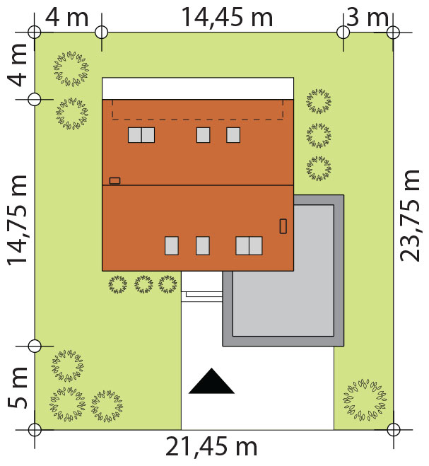W odróżnieniu od projektu Mona, dom Mona 2 posiada dodatkowo dwustanowiskowy garaż. Ze względu na to, powierzchnia minimalna działki będzie nieco większa i wynosić będzie 509,44 m2. W tym wypadku minimalna długość działki to 23,75 m, a minimalna szerokość działki to 21,45m. Przed kupnem projektu Mona 2 należy sprawdzić czy dany projekt będzie wpisywał się w wytyczne miejscowego plany zagospodarowania przestrzennego lub decyzję o warunkach zabudowy wydanych na działkę, na której miałby stanąć budynek. Trzeba też zwrócić uwagę na nieprzekraczalne linie zabudowy, które zazwyczaj są określane w miejscowych planach lub decyzjach. Może to sprawić , że minimalne wymiary działki będą większe niż te wyżej wymienione.