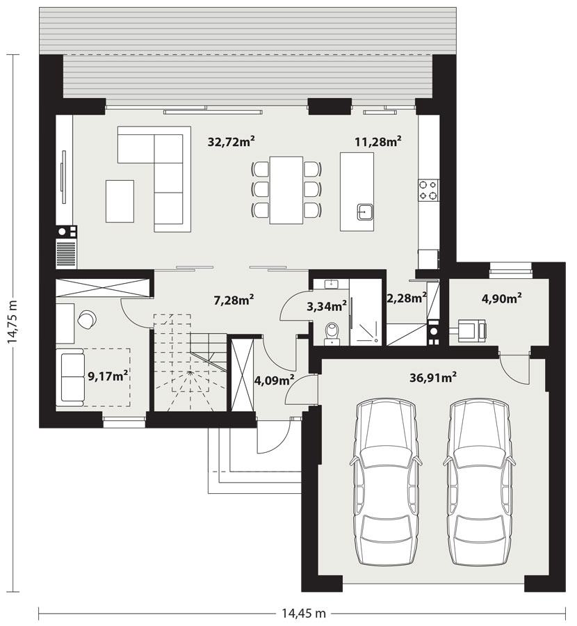 Mona 2 z użytkowym poddaszem to duży dom jednorodzinny. Projekt domu Mona wydaje się być doskonałym wyborem dla 4-5 osobowej rodziny ceniącej sobie komfort. Atutem projektu jest zaproponowanie bogatego programu funkcjonalnego. Wyjątkowo duży pokój dzienny w którym zostało przewidziane miejsce na kominek, połączony został z przestronną jadalnią i kuchnią. Obok kuchni z wyspą usytuowana została duża spiżarnia, która sprawi, że korzystanie z kuchni będzie jeszcze bardziej praktyczne. Cała strefa dzienna jest bardzo dobrze doświetlona dzięki ogromnym przeszkleniom i z pewnością spodoba się osobom preferującym nietuzinkowe rozwiązania. Przeszklenia te prowadzą na taras, który jest częściowo zadaszony i usytuowany na całej długości elewacji. Takie rozwiązanie okien daje efekt przenikania krajobrazu do wnętrza salonu i kuchni i sprawia że, wydają się być one jeszcze większy. Na projekcie parteru została zaprojektowana łazienka z kabiną prysznicową, wc i umywalką. Funkcjonalny program parteru uzupełnia dodatkowy pokój, który może być wykorzystany jako gabinet bądź sypialnia dla gości. Dość dużych rozmiarów wiatrołap wprowadzi nas do wnętrza domu, ale i do dwustanowiskowego garażu. Z garażu natomiast można się dostać do doświetlonej kotłowni, gdzie znajdzie się miejsce na kocioł gazowy lub kocioł na paliwo stałe. Wygodna klatka schodowa prowadzi na użytkowe poddasze o równie przestronnych wnętrzach.