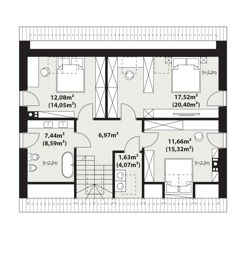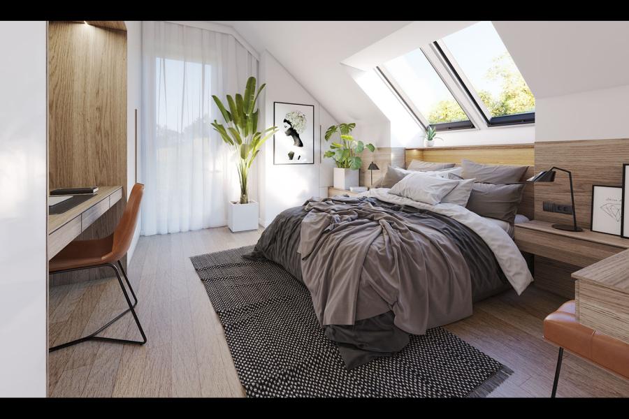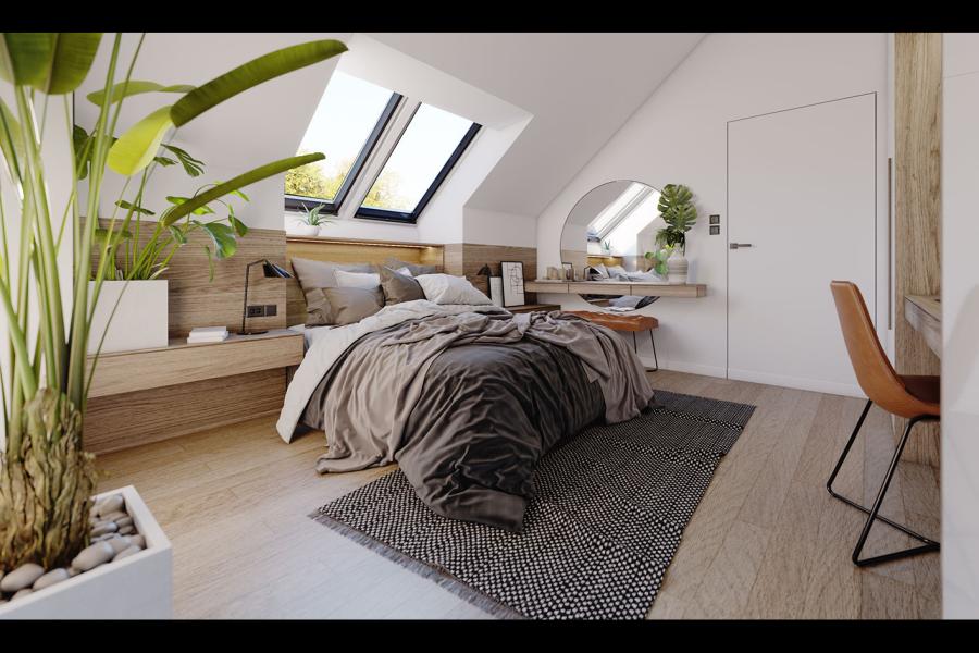 Na rzucie poddasza zaplanowane zostały trze sypialnie. Dodatkowo w sypialni głównej zostało wyodrębnione miejsce na pojemne szafy i kącik do pracy. Można też dokonać zmiany w projekcie i część tą wydzielić ściankami zyskując dodatkową garderobę. Wielkość sypialni i ich doświetlenie sprawiają, że pokoje będą idealne do codziennego funkcjonowania. Na piętrze znajduje się duża łazienka z możliwością zaprojektowania tam dwóch umywalek, wanny i wc. Dodatkowym atutem projektu jest pralnia znajdująca się w oddzielnym pomieszczeniu. Ci, którzy przy wyborze projektu kierują się funkcjonalnością, na pewno docenią układ przestrzenny projektu Mona.