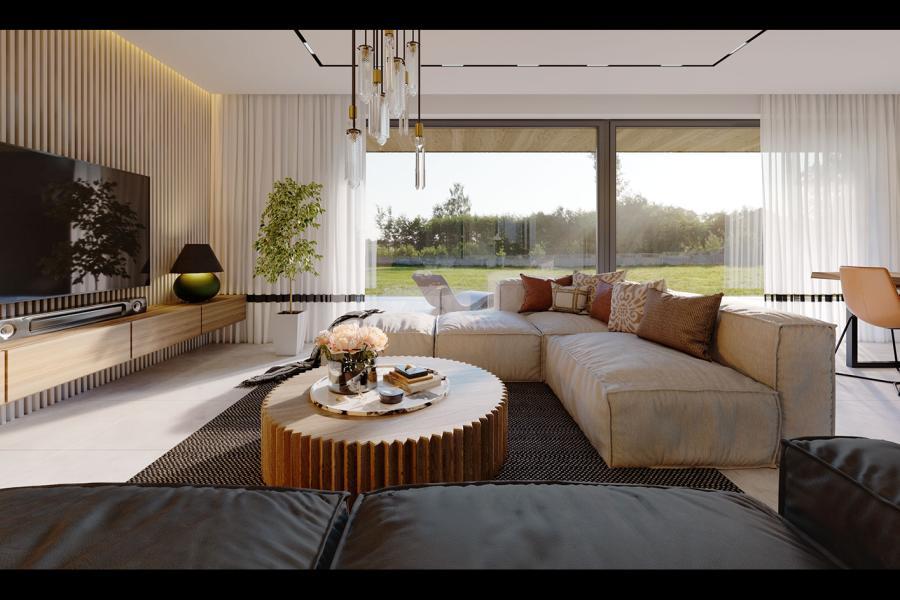 Projekt zwraca uwagę swoim ciekawym rozwiązaniem przestrzennym. Na rzucie parteru znajduje się wyjątkowo duży pokój dzienny z otwartą kuchnią. Są one doskonale doświetlone poprzez ogromne przeszklenia z wyjściem na taras. Daje to wrażenie przenikania krajobrazu (ogrodu) do wnętrza domu i sprawia, że część dzienna jest jeszcze większa. Takie rozwiązanie wprowadza do wnętrza bardzo dużo światła. Na parterze budynku dodatkowo został usytuowany gabinet, który może spełniać funkcję dodatkowej sypialni. Komfortowa łazienka pomieści sporą kabinę, umywalkę i misę ustępową. Z wiatrołapu mamy dostęp do sporej rozmiarów kotłowni. a wygodna klatka schodowa prowadzi na równie ciekawie rozplanowane poddasze użytkowe.
