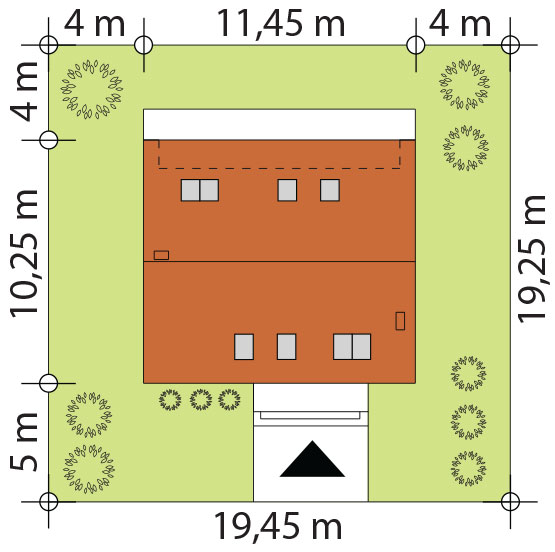 Dom zaprojektowano na planie prostokąta. Można go wpisać na działkę o minimalnej powierzchni 374,41 m2, czyli 19,25 m długość i 19,45 m szerokość. Tak jak przy każdym projekcie domu, także i w tym przypadku, posadowienie domu Mona na działce należy zaprojektować zgodnie z miejscowym planem zagospodarowania przestrzennego lub decyzją o warunkach zabudowy. Wymagania określone w tych dokumentach np. wyznaczenie nieprzekraczalnej linii zabudowy, mogą sprawić, że minimalne wymiary działki będą musiały być większe niż wyżej wymienione, a bryła domu Mona będzie musiała zostać odsunięta od granicy działki.