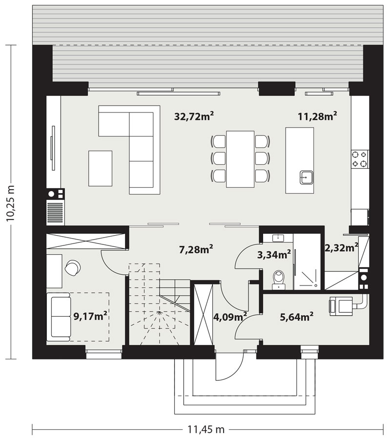 | Powierzchnia zabudowyPowierzchnia terenu, zajęta przez budynek w stanie wykończonym, bez tarasów, schodów zewnętrznych i podjazdów (PN-ISO 9836: 1997) | 117.36 m² |