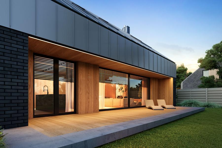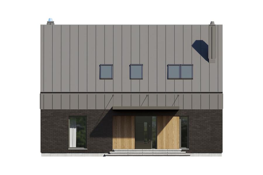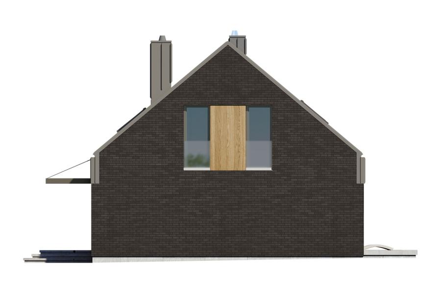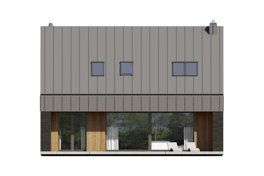 Mona to parterowy, duży dom jednorodzinny z poddaszem użytkowym. Jego nowoczesna forma z pewnością przypadnie do gustu osobom lubiącym prostą i nowoczesną architekturę. Rzut budynku został zaprojektowany na planie prostokąta z dwuspadowym dachem z oknami połaciowymi doświetlającymi sypialnie na poddaszu. Nowoczesności bryle dodaje brak okapów w dwuspadowym dachu budynku. Pokrycie dachu można wykonać np. z blachodachówki lub dachówki betonowej. Kąt nachylenia dachu to 40 stopni. Projekt domu Mona wydaje się mieć pokaźną sylwetkę, jednak olbrzymie przeszklenia nadają mu lekkości i niepowtarzalnego charakteru. Elewacje domu Mona zostały zaprojektowane z trzech materiałów: płytki elewacyjnej imitującej cegłę, drewnianej szalówki lub płyty HPL w ciepłym odcieniu i blachy w kolorze antracytowym. Ciekawym elementem bryły jest nadwieszony nad wejściem daszek osłaniający nas od deszczu. Takie rozwiązanie nie jest zbyt często spotykane w domach jednorodzinnych i na pewno wyróżnia dom Mona pośród innych projektów domów. W projekcie domu Mona uwagę zwraca również duży taras. Częściowe zadaszenie zapewni komfort użytkowania w czasie niepogody.
