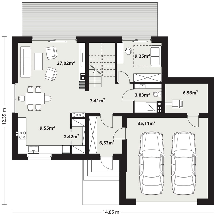 | Powierzchnia zabudowyPowierzchnia terenu, zajęta przez budynek w stanie wykończonym, bez tarasów, schodów zewnętrznych i podjazdów (PN-ISO 9836: 1997) | 147.13 m² |