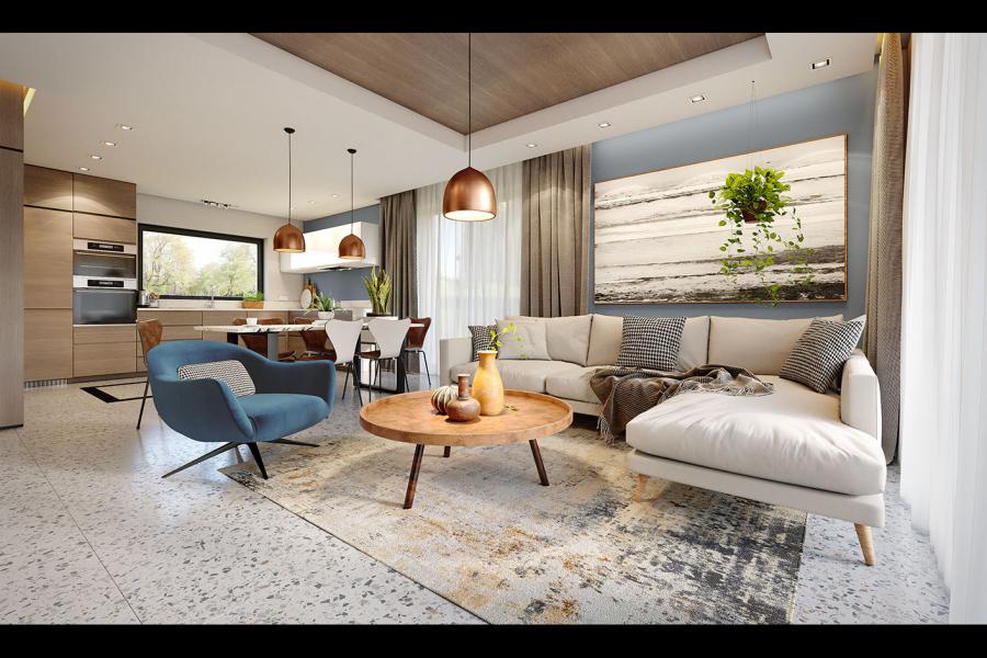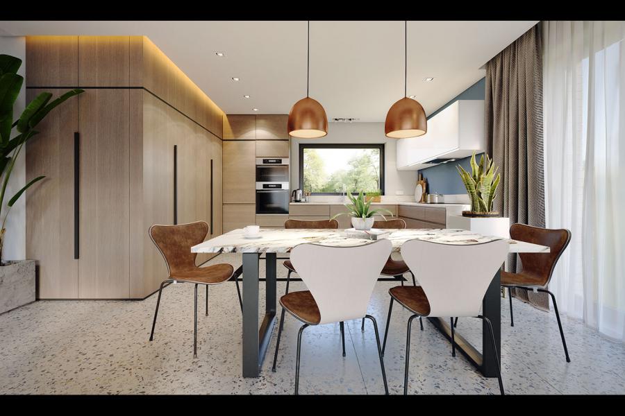 Nemini to jednorodzinny budynek mieszkalny, parterowy z użytkowym poddaszem. Projekt charakteryzuje się prostą bryłą z dwuspadowym dachem, co czyni go niedrogim w budowie i tanim w eksploatacji. Elewacje zostały urozmaicony drewnianą szalówką i beżową płytką elewacyjną imitującą cegłę. Grafitowy dach bezokapowy oraz szklane balustrady nadają budynkowi nowoczesnego charakteru. Ergonomicznie zaprojektowana i wyraźnie podzielona przestrzeń mieszkalna składa się ze strefy dziennej, nocnej i gospodarczej. Najbardziej reprezentacyjna część domu, to przestronny salon połączony z jadalnią, który otwiera się na duży taras oraz kuchnia ze spiżarnią. Oprócz części dziennej przewidziano na parterze dodatkowy pokój, który można wykorzystać na gabinet lub kolejną sypialnię. Na poddaszu przewidziano 3 sypialnie, łazienkę i pralnię. Największa sypialnia ma dodatkowo własną łazienkę i garderobę. Dużą kotłownię, na każdy rodzaj paliwa zlokalizowano w części gospodarczej domu.