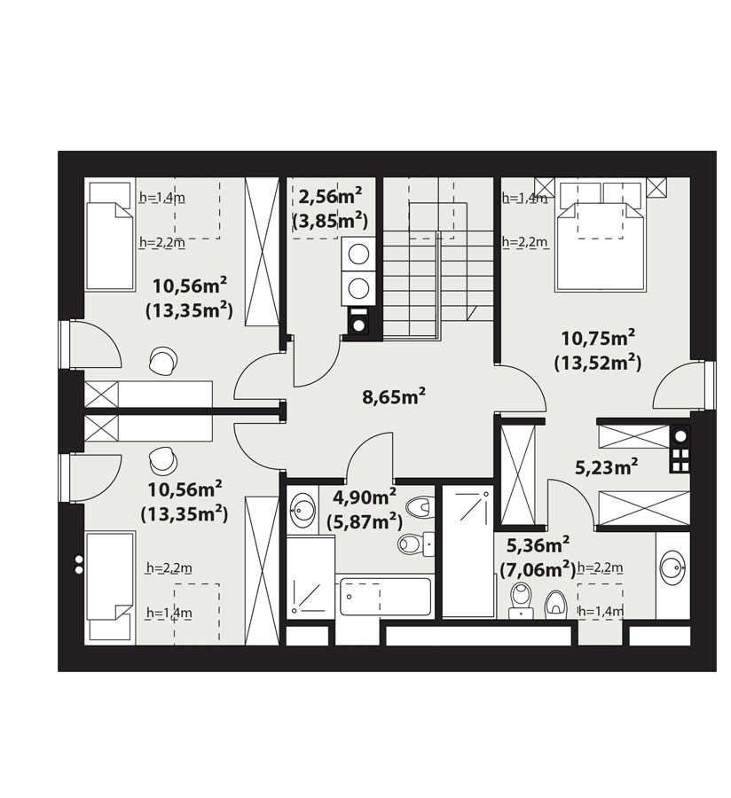 | Powierzchnia użytkowaDla domów parterowych: Suma powierzchni użytkowych wszystkich pomieszczeń bez garażu. Dla domów z poddaszem (dach spadzisty): Suma powierzchni użytkowych wszystkich pomieszczeń bez garażu i strychu. Na poddaszu, pod skosami dachu powierzchnię użytkową liczono wg zasady: - powyżej 2,2m wysokości pomieszczenia powierzchnia liczona w 100%, - pomiędzy 1,4m a 2,2m w 50%, - poniżej 1,4m powierzchnia nie jest brana pod uwagę. | 127.34 m² |