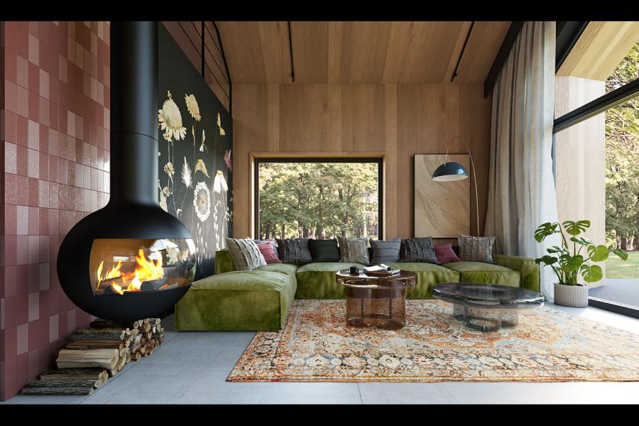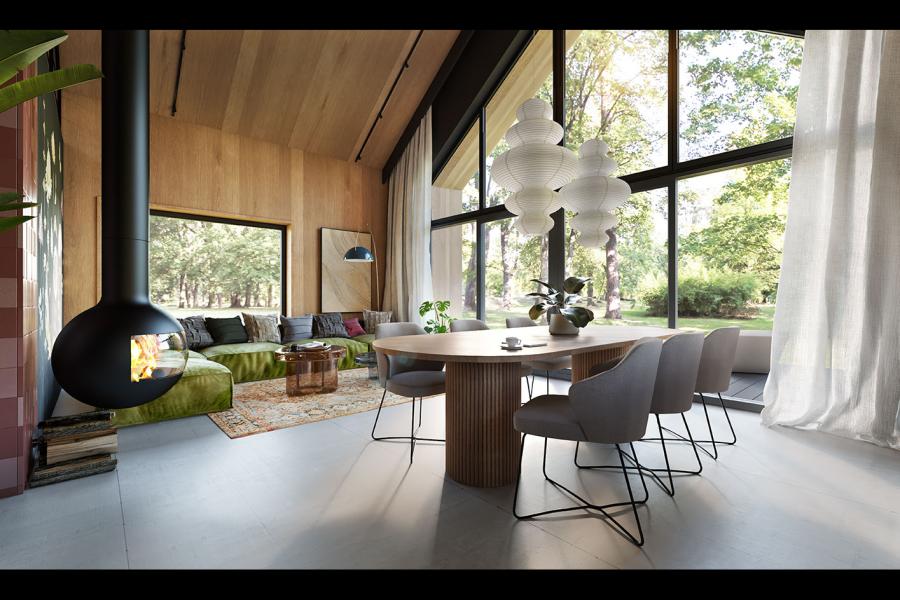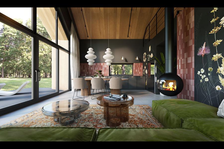 Wnętrze Neo 2 zaskakuje przestronnością i światłem. Centralnym punktem jest otwarta strefa dzienna o powierzchni 36,00 m², łącząca salon, jadalnię oraz kuchnię. Dzięki ogromnemu, trójkątnemu przeszkleniu w ścianie szczytowej, granica między wnętrzem a ogrodem zaciera się, a salon wypełnia naturalne światło o każdej porze dnia. Wyjątkowym detalem aranżacyjnym jest nowoczesny, podwieszany kominek o sferycznym kształcie, który dodaje wnętrzu luksusowego sznytu.