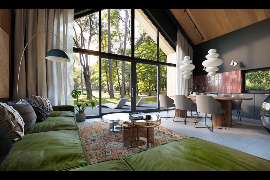 - Spektakularne przeszklenia: Trójkątne okno w ścianie szczytowej zapewnia niesamowity efekt wizualny i doskonałe doświetlenie salonu.