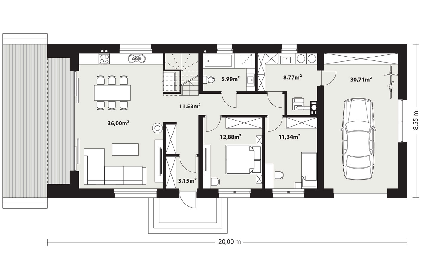 Projekt Neo 2 to kwintesencja stylu nowoczesnej stodoły, idealnie wpisująca się w potrzeby inwestorów posiadających szerokie, ale stosunkowo płytkie działki. Minimalne wymiary terenu potrzebne do realizacji tego domu to 28,00 m szerokości oraz 17,55 m długości. Dom został zaprojektowany na planie wydłużonego prostokąta o wymiarach 20,00 m na 8,55 m, co pozwala na optymalne wykorzystanie przestrzeni ogrodu.