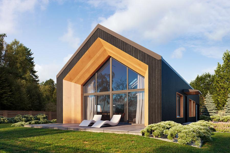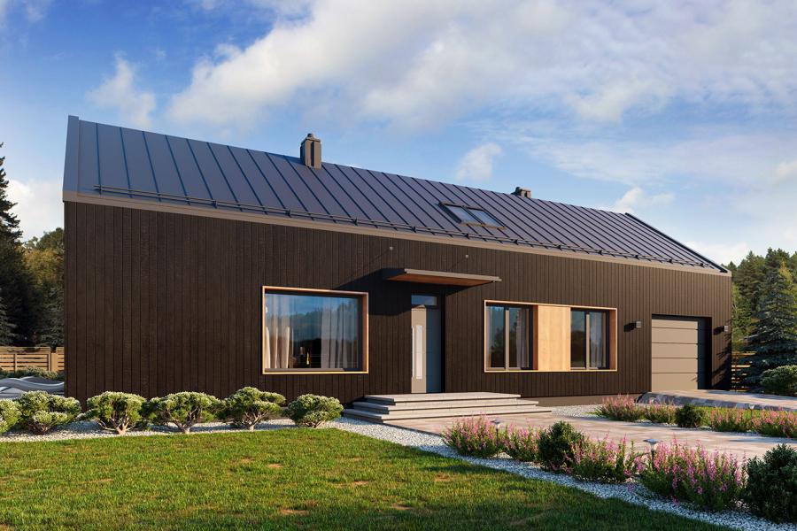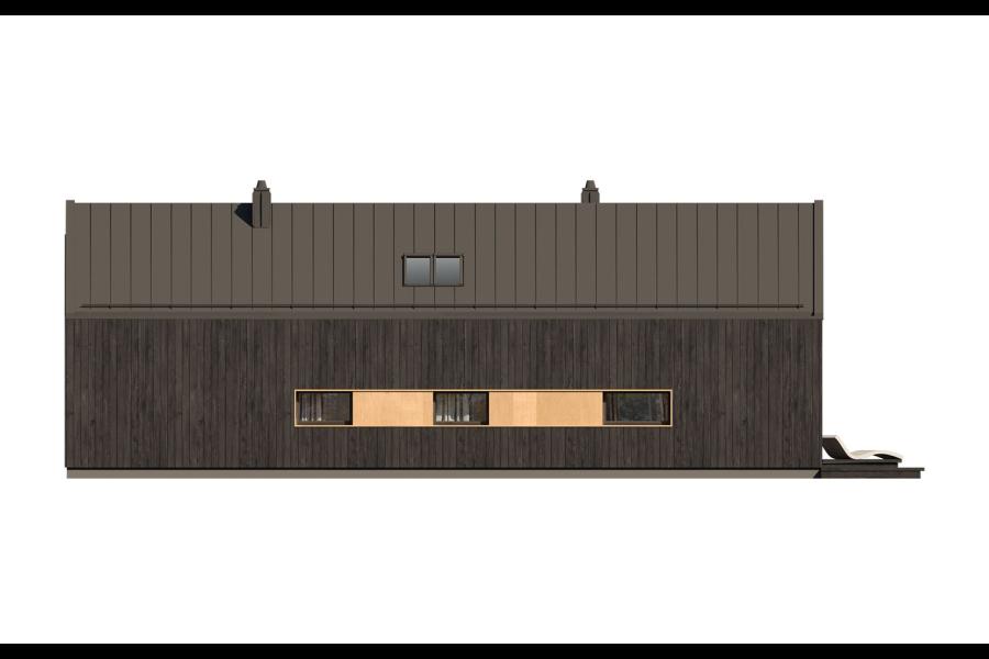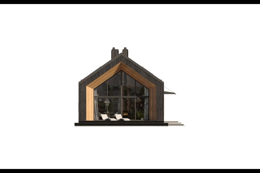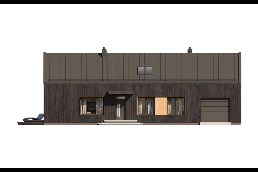 Elewacja budynku przyciąga wzrok surową elegancją. Zastosowano tu system elewacji wentylowanej na ruszcie, zdominowanej przez pionowe deskowanie w ciemnym, niemal czarnym kolorze, które doskonale kontrastuje z jasnym wykończeniem wnęk okiennych i tarasowych. Dwuspadowy dach bez okapów, pokryty dachówką lub blachodachówką, podkreśla minimalistyczny charakter bryły.
