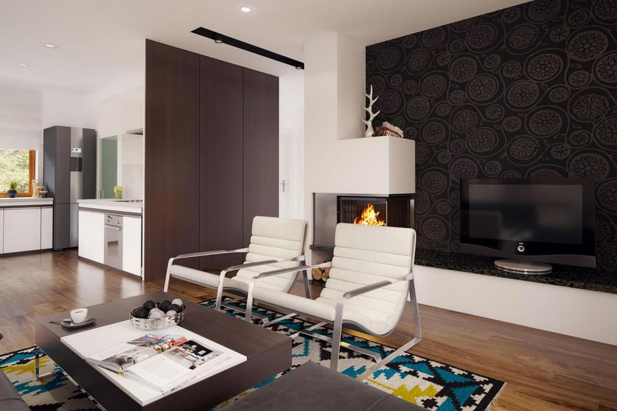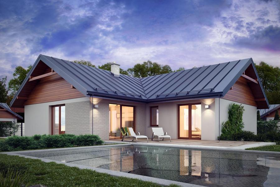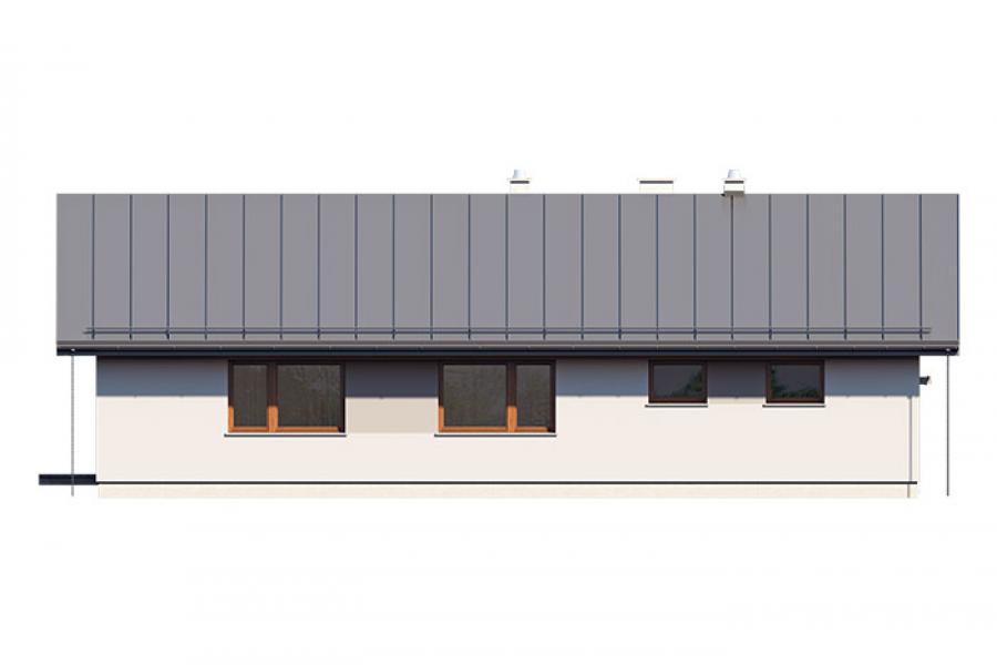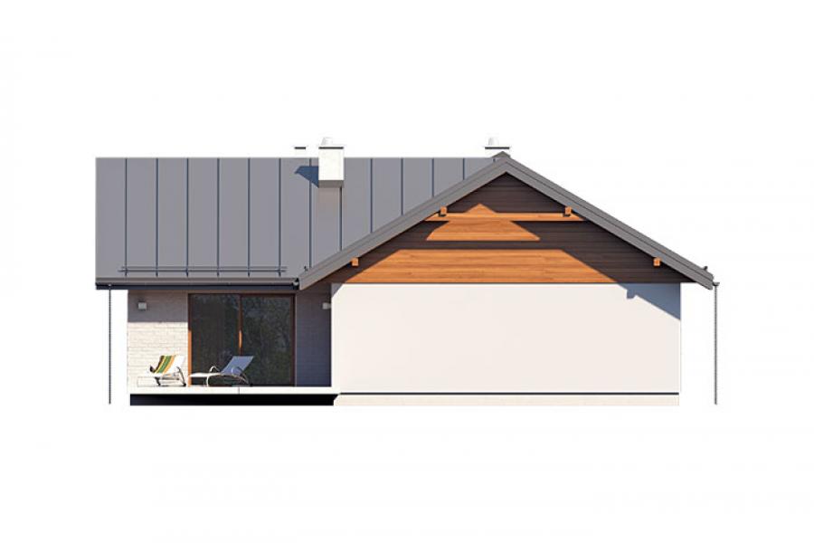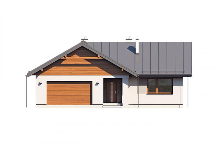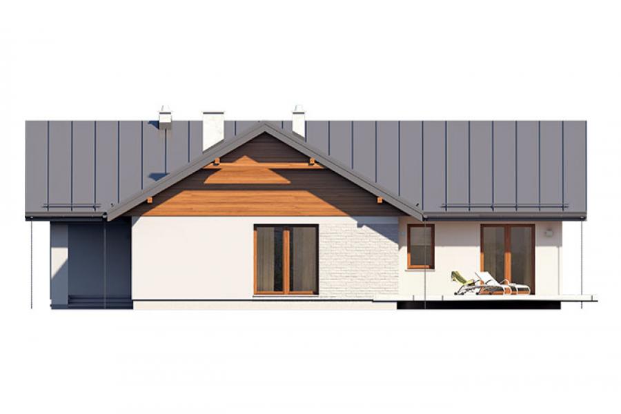 Jednorodzinny budynek mieszkalny, parterowy, niepodpiwniczony z jednostanowiskowym garażem. Funkcjonalny i optymalny układ pomieszczeń zapewnia komfort 4-osobowej rodzinie. Ergonomicznie zaprojektowana przestrzeń została wyraźnie podzielona na część dzienną, nocną i gospodarczą. Część reprezentacyjna domu, to przestronny salon połączony z jadalnią oraz kuchnia ze spiżarnią. Oprócz części dziennej, przewidziano strefę intymną domu, która składa się z trzech sypialni oraz łazienki. Największa sypialnia posiada własną, oddzielną garderobę i łazienkę. Dużą kotłownię oraz garaż zaprojektowano w części gospodarczej domu. Ciekawie zaprojektowaną wnękę w garażu można wykorzystać jako pomieszczenie gospodarcze. Geometria rzutu oraz prostota bryły czynią ten dom tanim i prostym w budowie oraz niedrogim w utrzymaniu i eksploatacji.