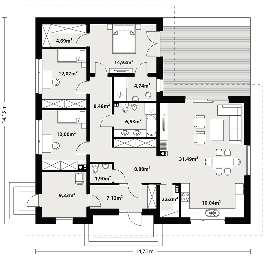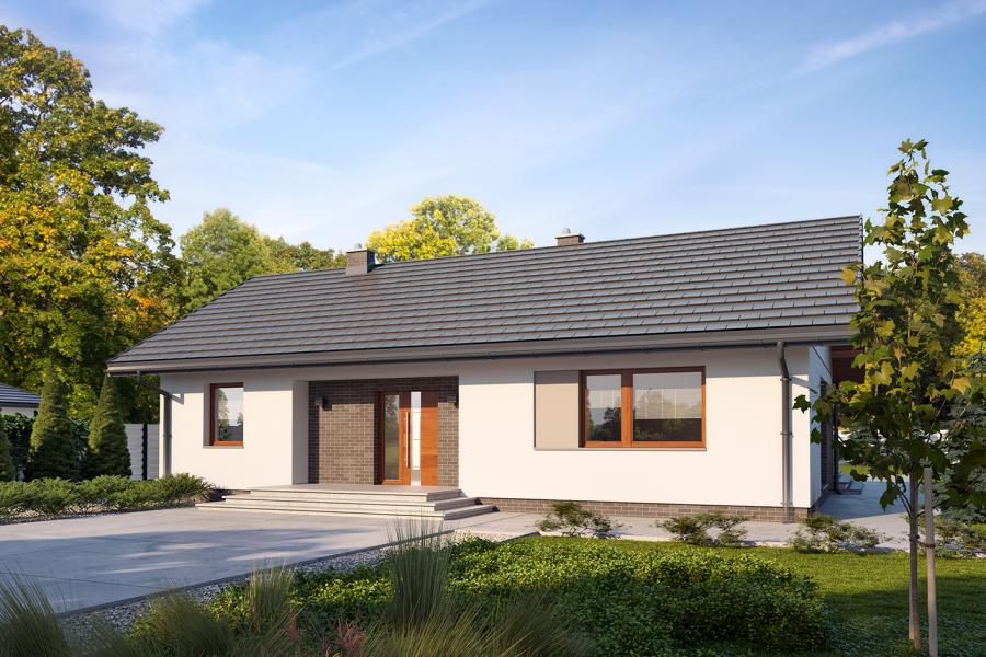 Niko 3 to projekt parterowego domu jednorodzinnego odpowiadający optymalnym potrzebom 4-osobowej rodziny. Dzięki ustawnej i ergonomicznie rozplanowanej przestrzeni, z wyraźnym podziałem na strefy, jest wygodny i funkcjonalny w użytkowaniu. Przestronna część dzienna to proste i klasyczne połączenie salonu, jadalni i kuchni ze spiżarnią, zaś strefa intymna składa się z 3 sypialni i łazienki. Największa sypialnia posiada własną garderobę i łazienkę. Wejście do domu jest przez praktyczny podcień chroniący przed deszczem i słońcem. Z samego wiatrołapu prowadzi wejście do dużej kotłowni na każdy rodzaj paliwa. Prosta i zwarta bryła budynku, przykryta dwuspadowym dachem, pozwala na łatwą i stosunkowo niedrogą budowę.