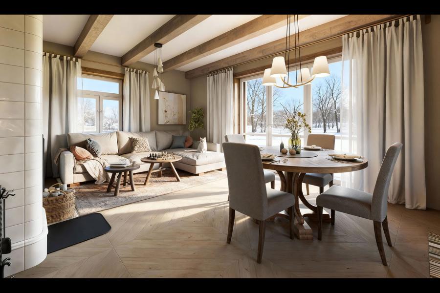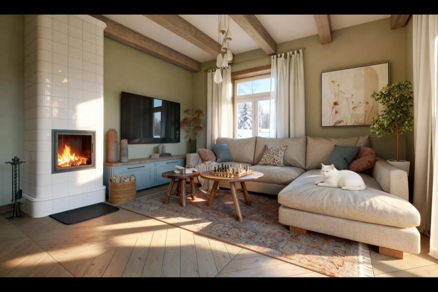 - Energooszczędność: Projekt dostosowany do ogrzewania pompą ciepła i wyposażony w kominek.