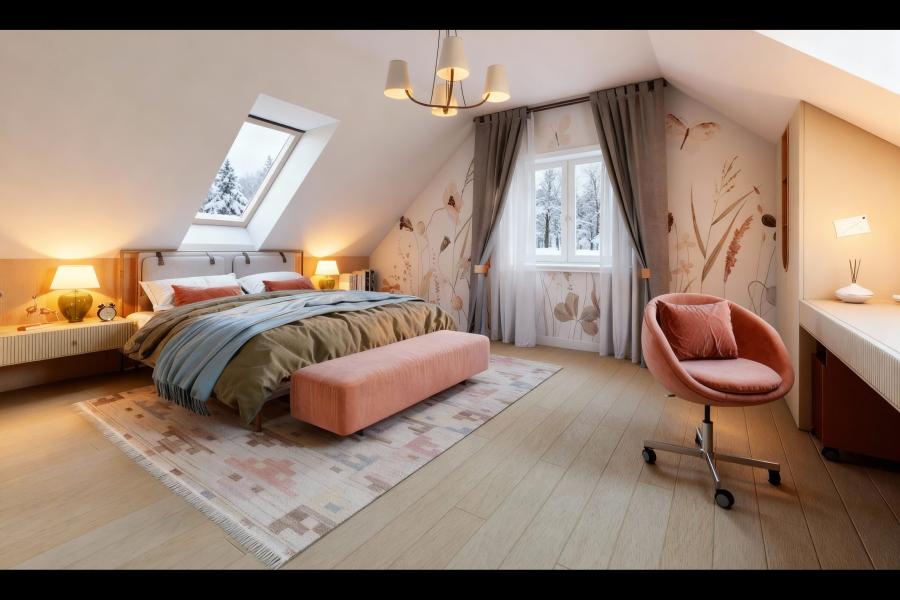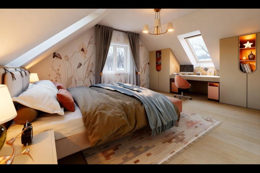 Poddasze użytkowe to strefa prywatna domowników. Zaplanowano tu dwie ustawne sypialnie oraz drugą łazienkę, co zapewnia komfort 4-5 osobowej rodzinie. Co niezwykle istotne, wszystkie ściany wewnętrzne (zarówno na parterze, jak i na poddaszu) są ścianami działowymi. To unikalna cecha konstrukcyjna, która daje Inwestorowi niemal nieograniczone możliwości aranżacji przestrzeni i dostosowania układu pomieszczeń do indywidualnych potrzeb – od otwarcia przestrzeni po wydzielenie dodatkowych schowków czy garderób.