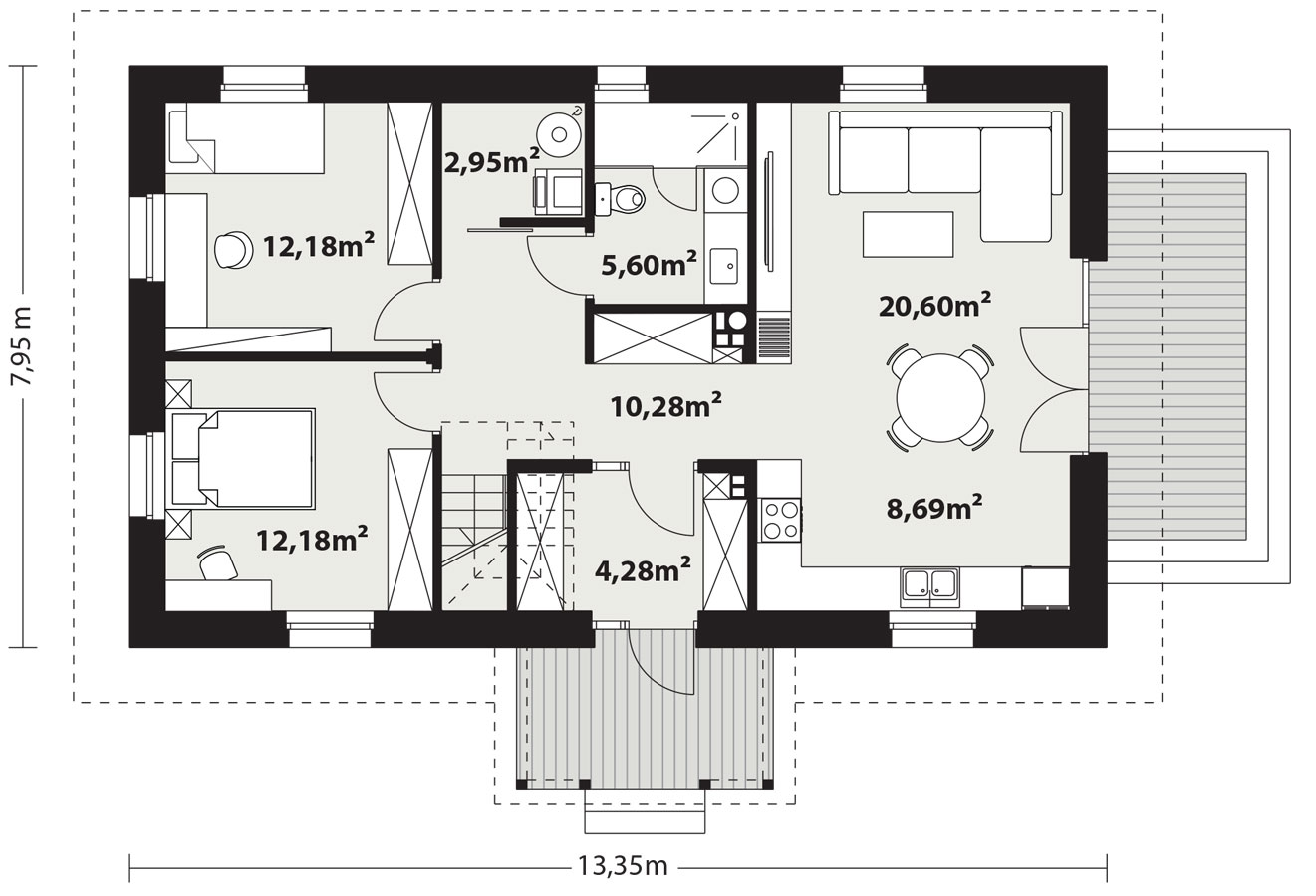 - Bogaty program funkcjonalny: Aż 4 sypialnie (2 na parterze, 2 na poddaszu) przy stosunkowo niedużej powierzchni zabudowy.