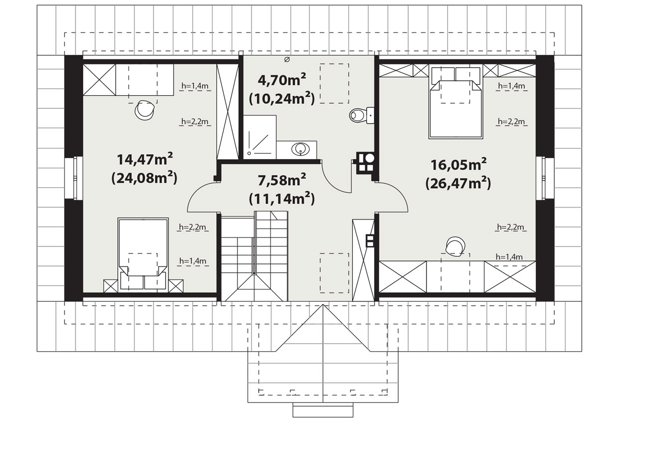 | Powierzchnia użytkowaDla domów parterowych: Suma powierzchni użytkowych wszystkich pomieszczeń bez garażu. Dla domów z poddaszem (dach spadzisty): Suma powierzchni użytkowych wszystkich pomieszczeń bez garażu i strychu. Na poddaszu, pod skosami dachu powierzchnię użytkową liczono wg zasady: - powyżej 2,2m wysokości pomieszczenia powierzchnia liczona w 100%, - pomiędzy 1,4m a 2,2m w 50%, - poniżej 1,4m powierzchnia nie jest brana pod uwagę. | 119.56 m² |