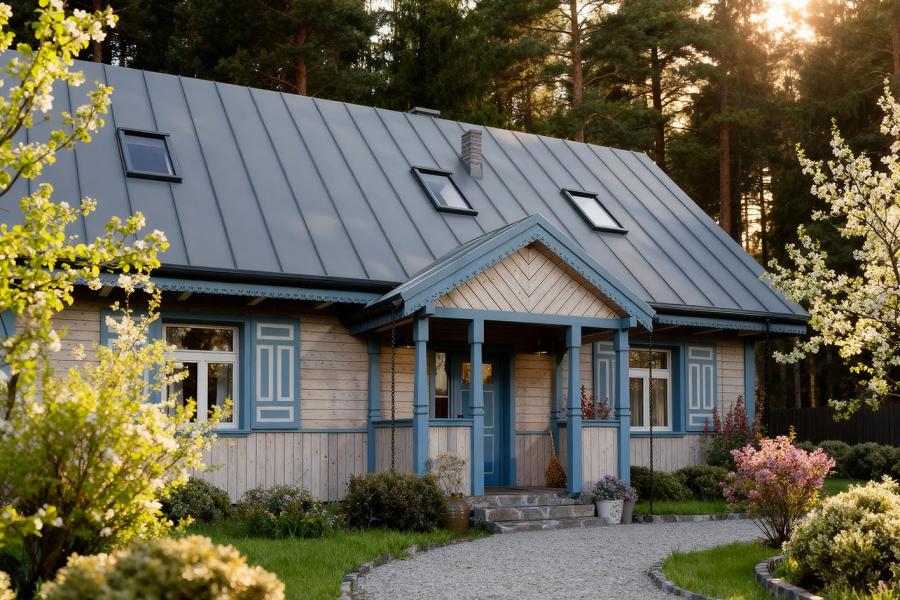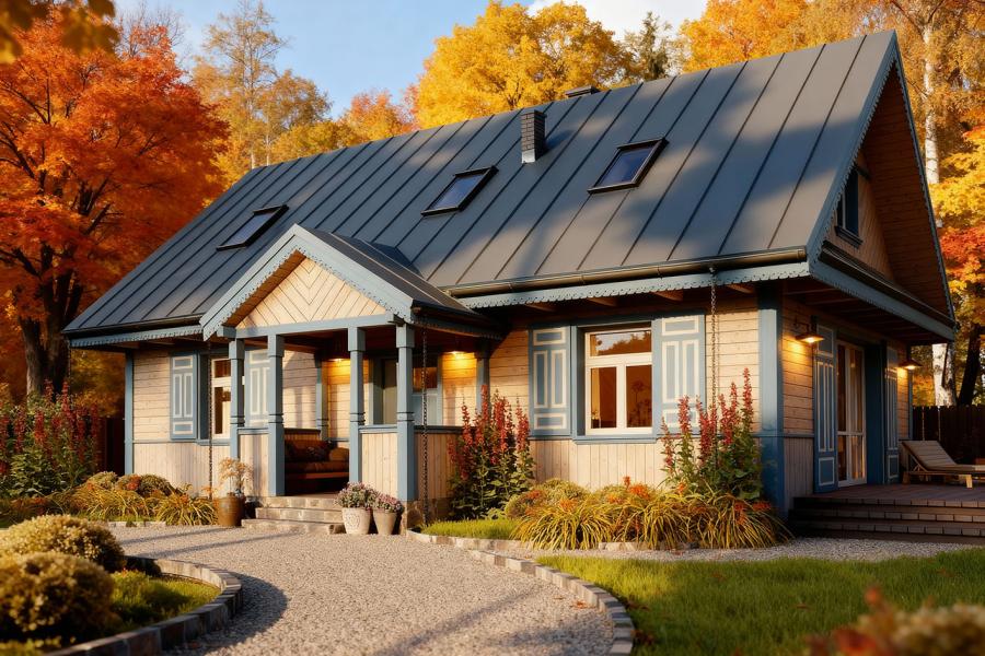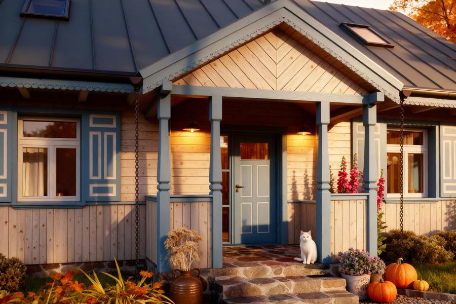 - Klimatyczny ganek: Zadaszona weranda wejściowa nawiązująca do stylu tradycyjnych domów wiejskich.