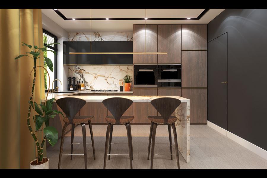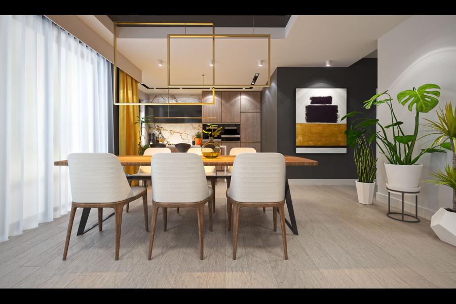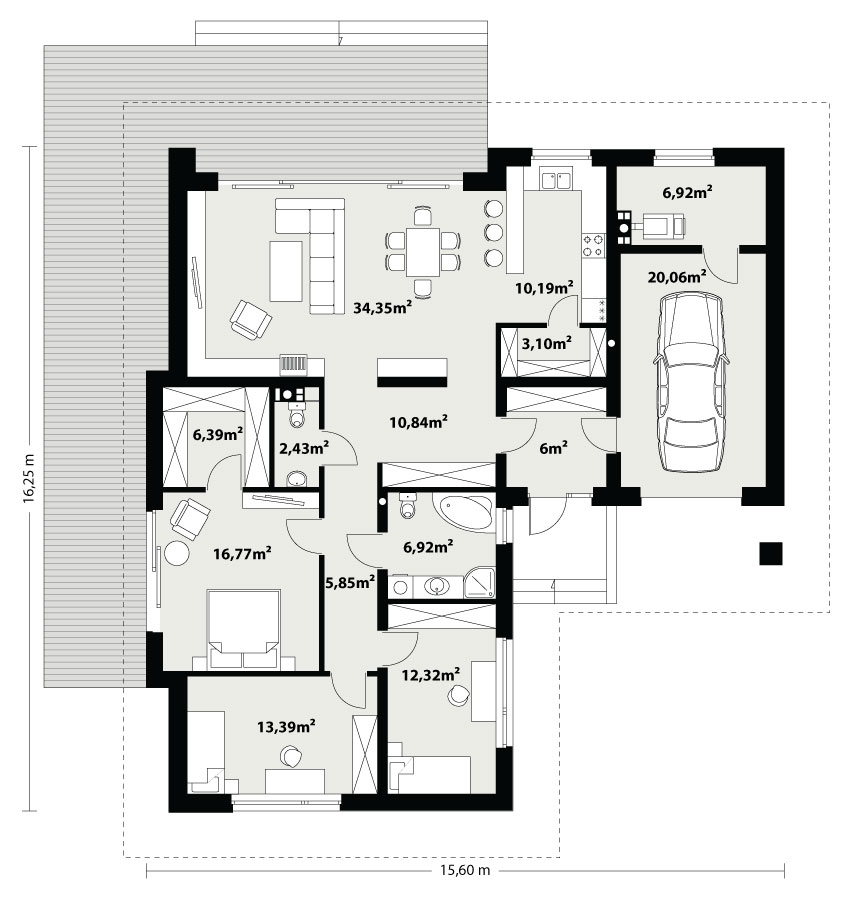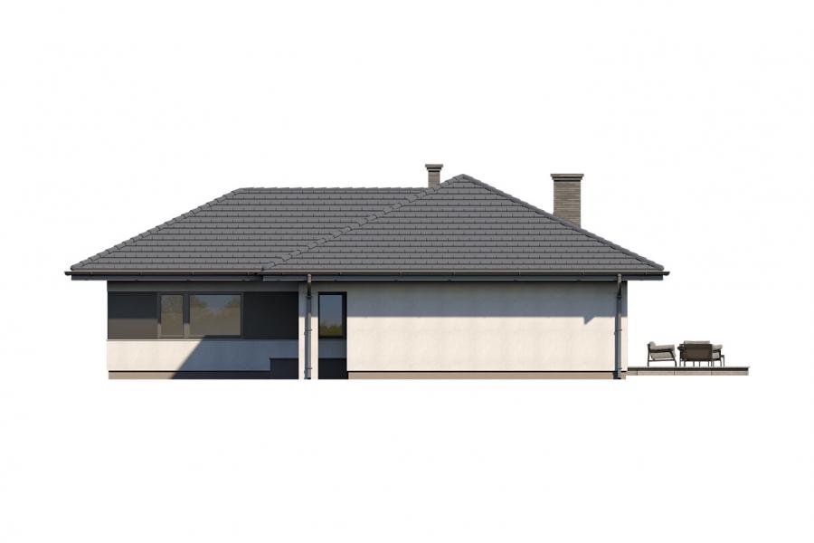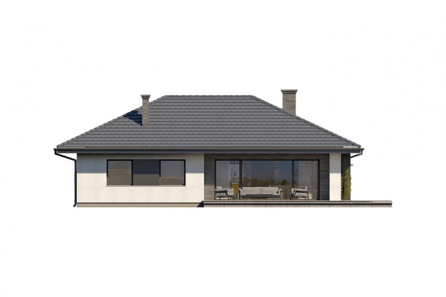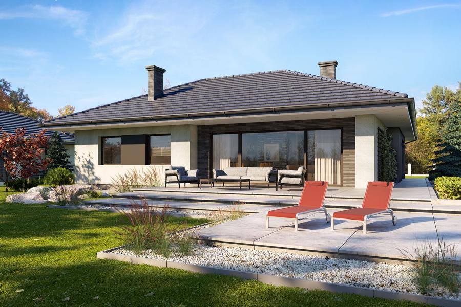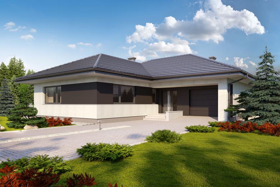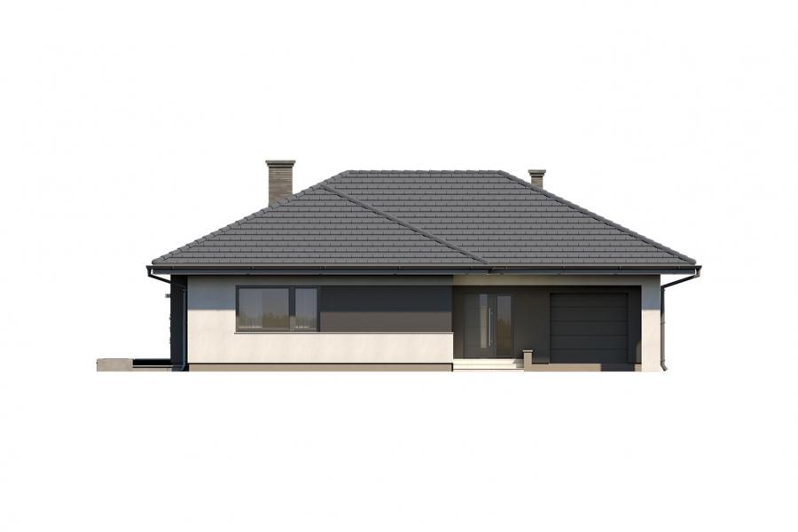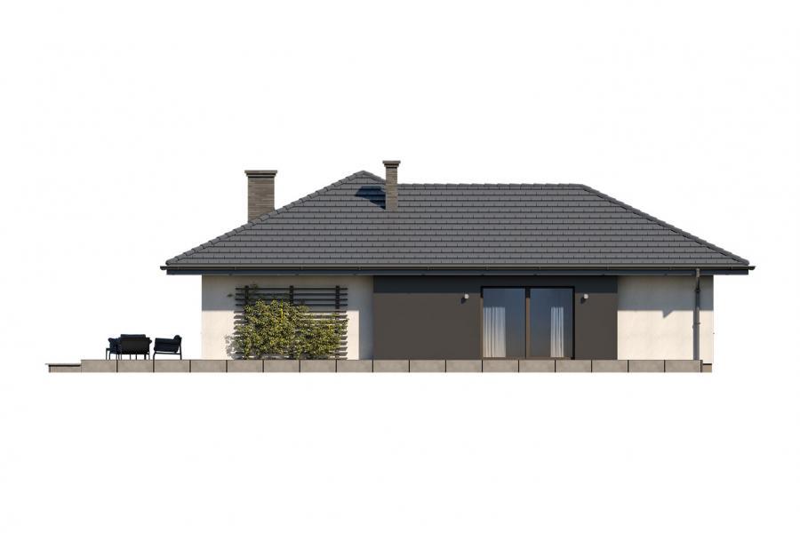Parterowy dom jednorodzinny, niepodpiwniczony z jednostanowiskowym garażem. Ten wygodny dom, swoim pełnym programem funkcjonalnym zapewnia komfort 4 – osobowej rodzinie. Przestronna część dzienna to salon połączony z jadalnią, otwierający się na ogród poprzez ogromne przeszklenie oraz otwarta kuchnia wraz z półwyspem i ze spiżarnią. Tak zaproponowany, ciekawy i przestronny układ pomieszczeń umożliwia dowolność i szereg aranżacji. Część nocna to 3 wygodne sypialnie, z czego największa posiada garderobę oraz łazienkę, gdzie przewidziano miejsce na pralkę. W domu zaprojektowano dużą kotłownię dostępną z garażu, której parametry pozwalają na montaż kotła na każdy rodzaj paliwa, w tym na paliwo stałe. Sam garaż, którego wielkość przekracza parametry standardowego garażu jednostanowiskowego, umożliwia umieszczenie tam np. kosiarki. Ten optymalny i ciekawy program funkcjonalny został ujęty w prostej bryle na rzucie litery L, przykrytej wielospadowym dachem. Atutem projektu jest jego prostota zarówno w układzie pomieszczeń jaki i w rozwiązaniach elewacji, gdzie elegancki, nowoczesny styl osiągnięto poprzez klasyczne, proste ale szlachetne materiały takie jak szalówka, oraz delikatny, subtelny detal.