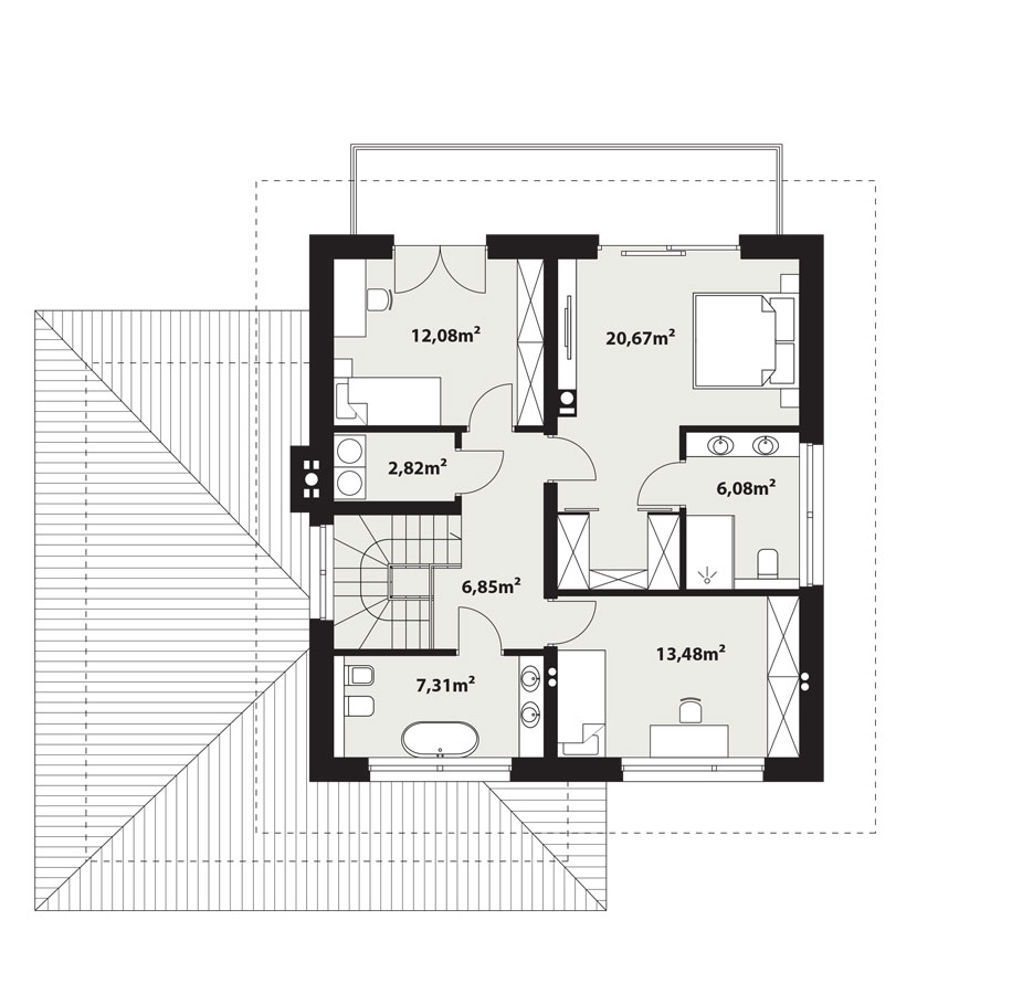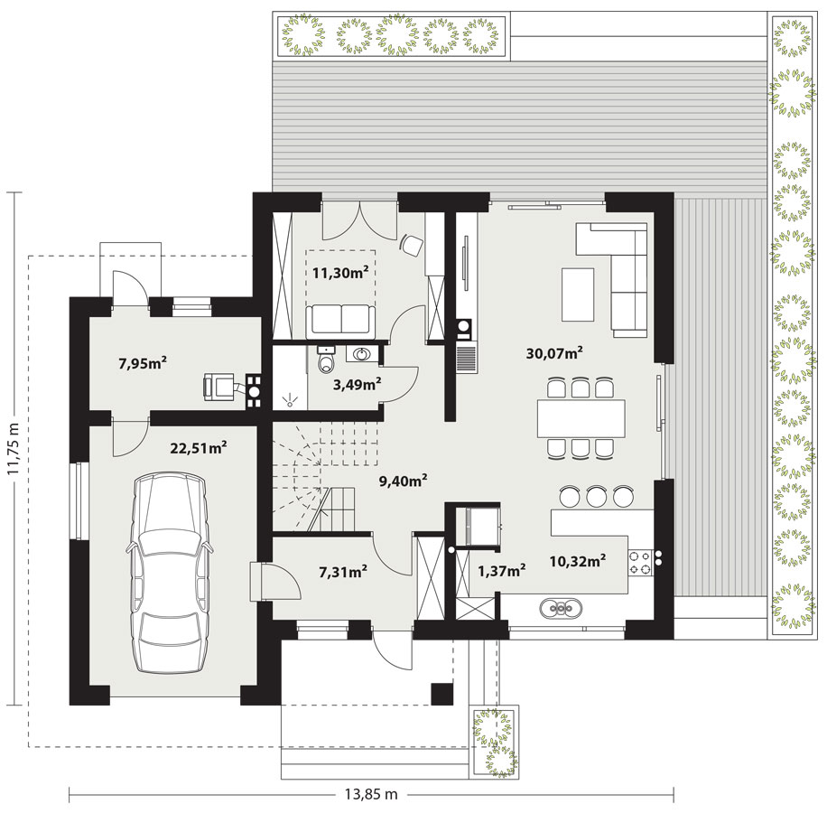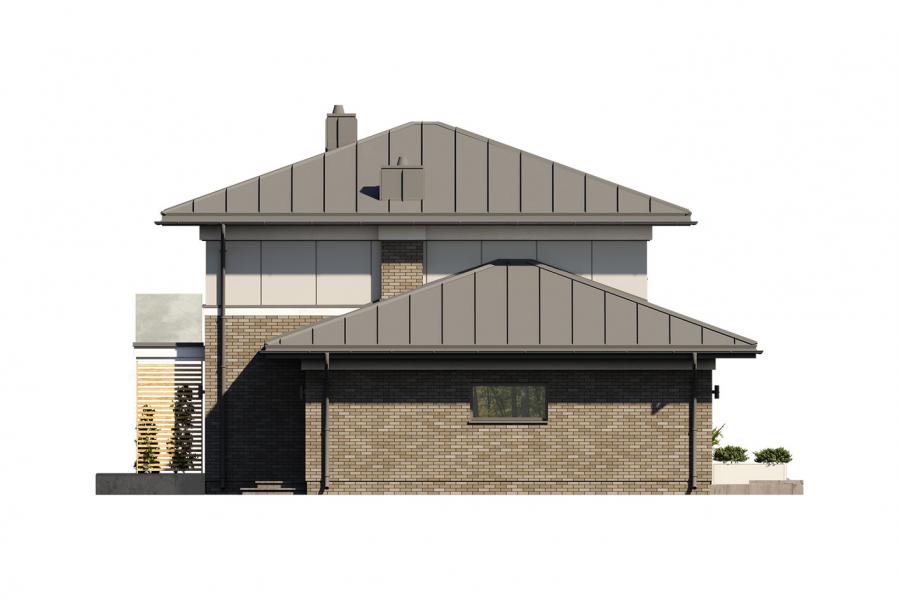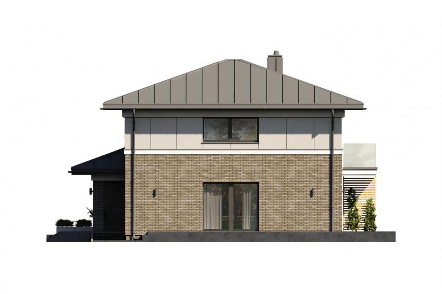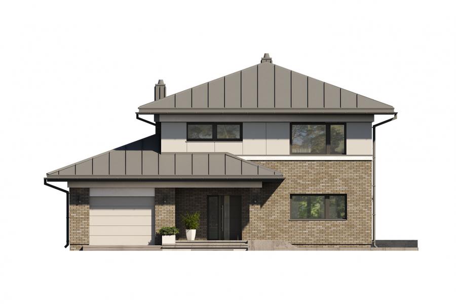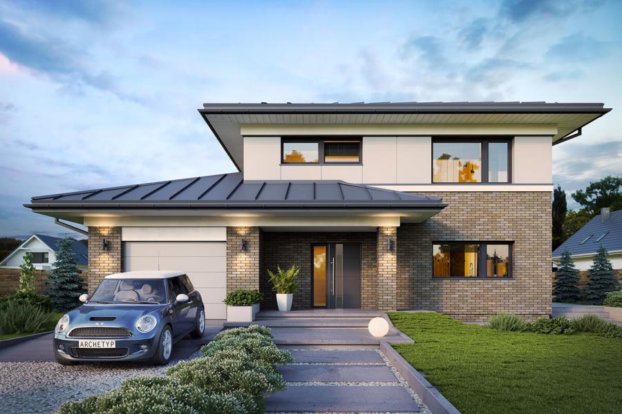 Terra, to projekt reprezentacyjnego domu piętrowego przeznaczonego dla 4-osobowej rodziny. Jest to typowo miejska rezydencja o nowoczesnym wyglądzie i optymalnej powierzchni użytkowej. Posiada bogaty program funkcjonalny, rozłożony na dwóch pełnych kondygnacyjnych, który zapewni komfort nawet dla wymagających inwestorów. Parter zaprojektowano jako otwartą przestrzeń dzienną, złożoną z połączonego salonu, jadalni i kuchni. Przewidziano tutaj także dodatkowy pokój, który można wykorzystać jako gabinet lub dodatkową sypialnię. Na parterze znajduje się również duża kotłownia, na każdy rodzaj paliwa oraz jednostanowiskowy garaż. Dzięki osłonięciu częściowo zadaszonych tarasów, uzyskano na tarasie prywatną strefę wypoczynku. Na piętrze zaprojektowano 3 sypialnie, łazienkę i pralnię. Główna sypialnia ma zapewnioną własną garderobę oraz łazienkę. Taką dodatkową przestrzeń można według potrzeb przerobić np. na kącik do pracy. Terra zachwyca wysmakowaną, ponadczasową, klasyczną bryłą ujętą we współczesny elegancki wizerunek. Rezydencja ta stanowi doskonałą propozycję dla inwestorów poszukujących komfortowego domu w estetycznym wydaniu.
