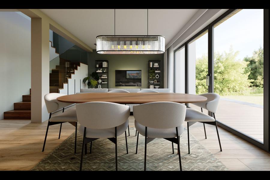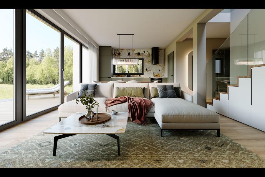 Największym atutem bryły jest duży taras . Dzięki temu strefa wypoczynkowa „wędruje” za słońcem, zapewniając mieszkańcom idealne miejsce do relaksu od świtu do zmierzchu. Duże przeszklenia nie tylko doświetlają wnętrze, ale otwierają dom na ogród, optycznie powiększając przestrzeń dzienną.