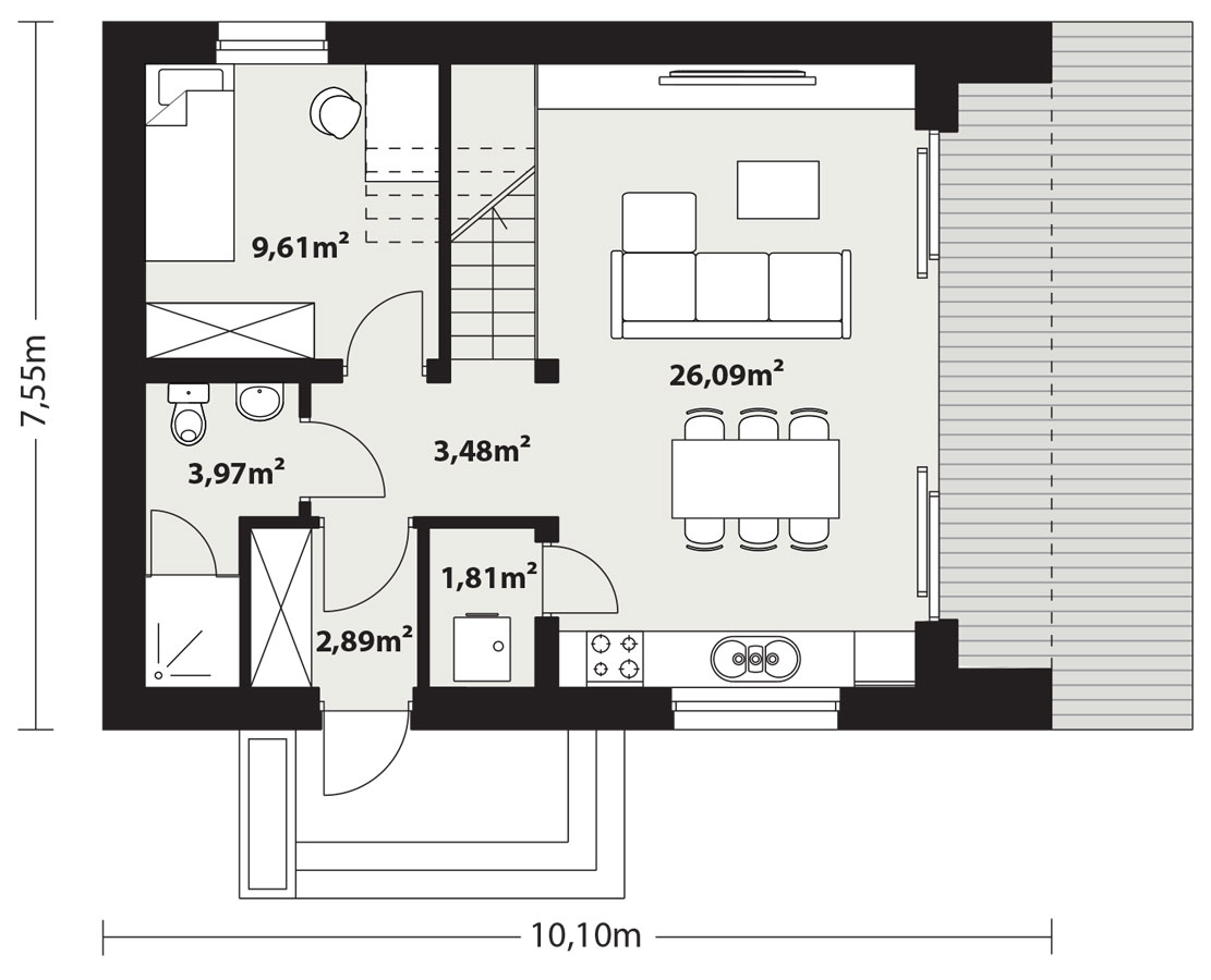 Mimo powierzchni zabudowy wynoszącej zaledwie 70 m2, układ funkcjonalny zaskakuje przestronnością: