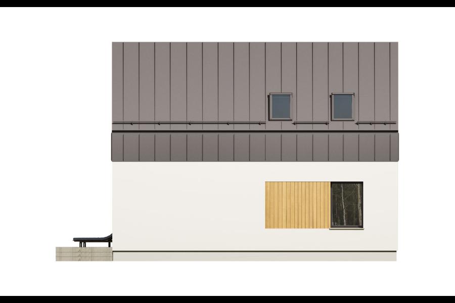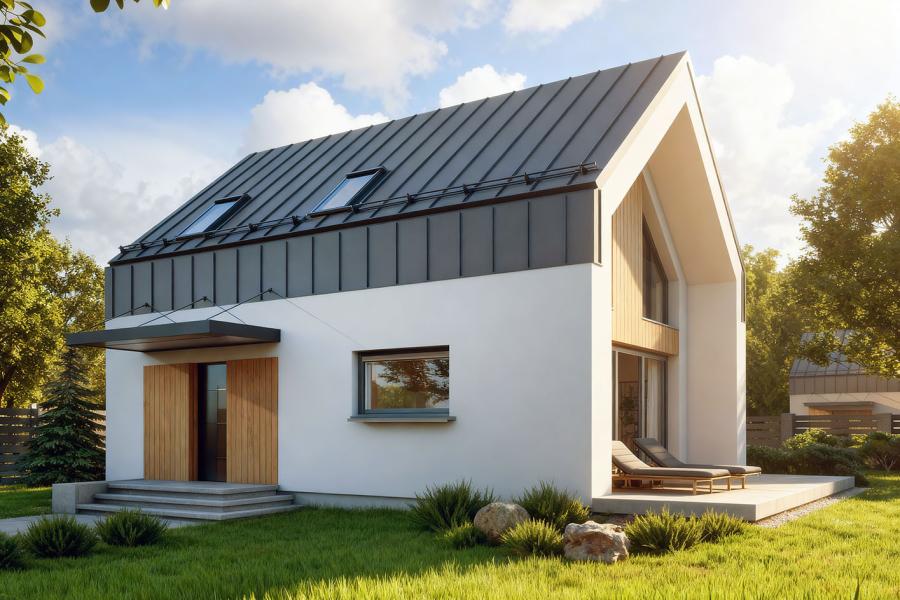 Dom przyciąga wzrok bezokapowym dachem i elewacją, która jest grą kontrastów. Antracytowa blacha na rąbek stojący, przechodząca z połaci dachowych na ściany szczytowe, została zestawiona z jasnym tynkiem i ciepłym, naturalnym drewnem. Takie połączenie materiałów nadaje budynkowi unikalnego, prestiżowego charakteru.
